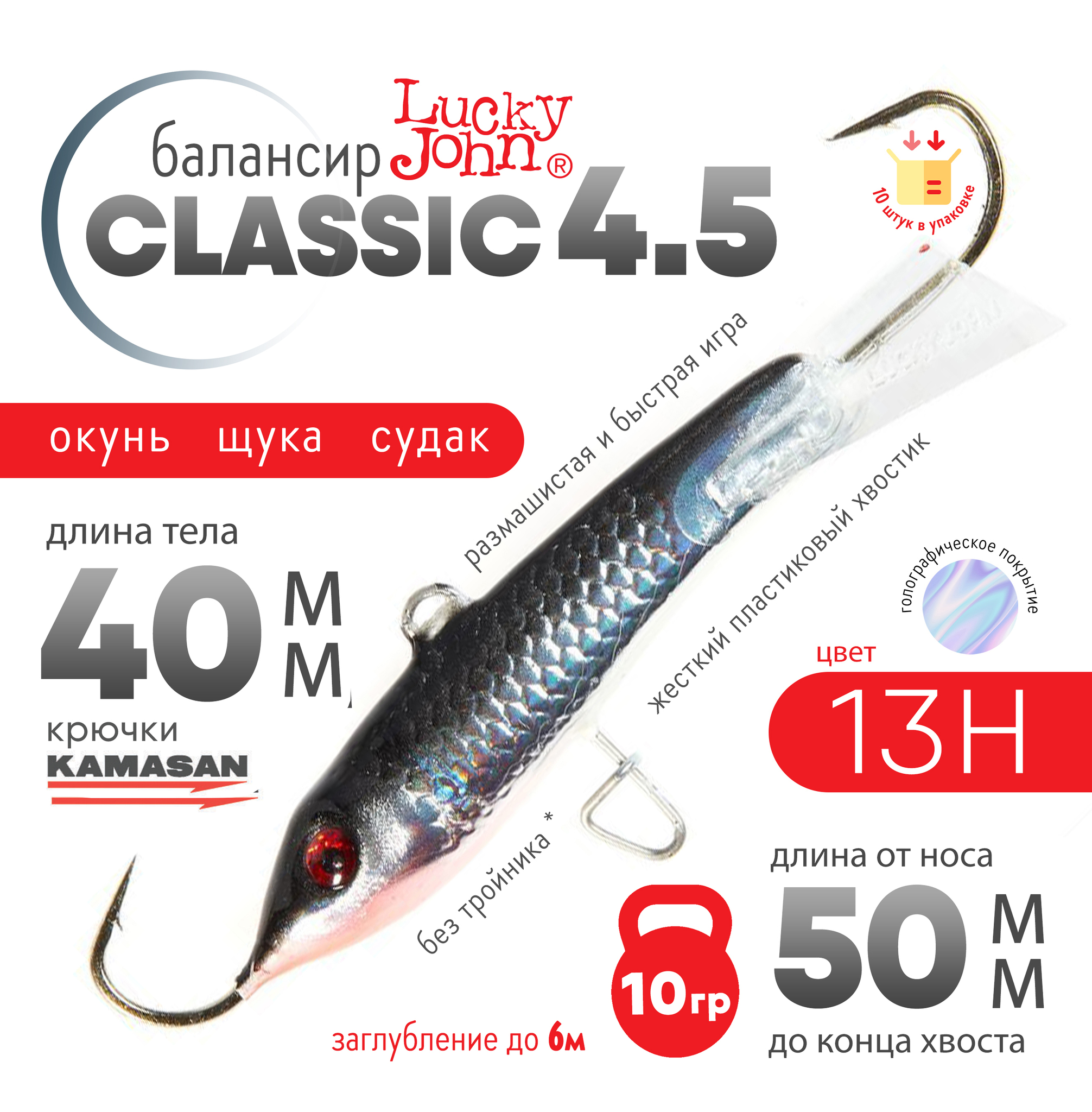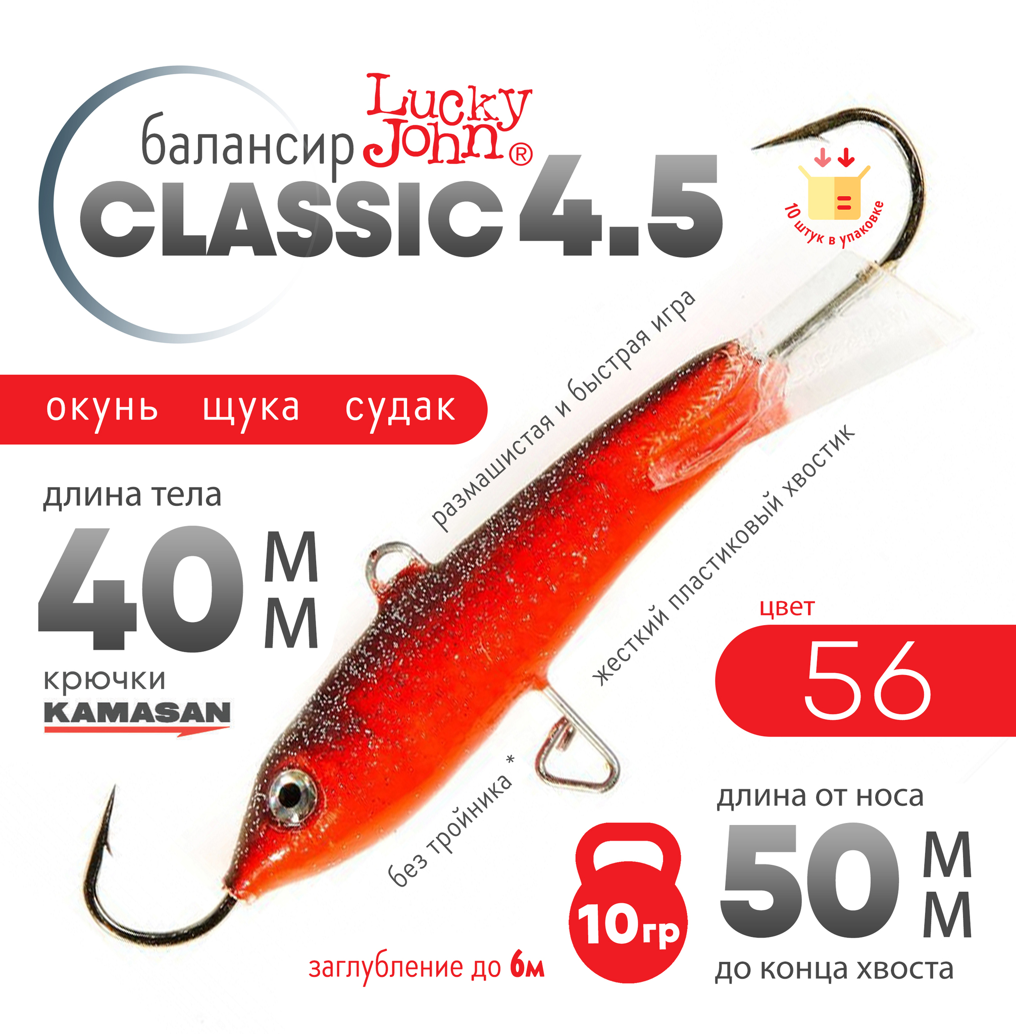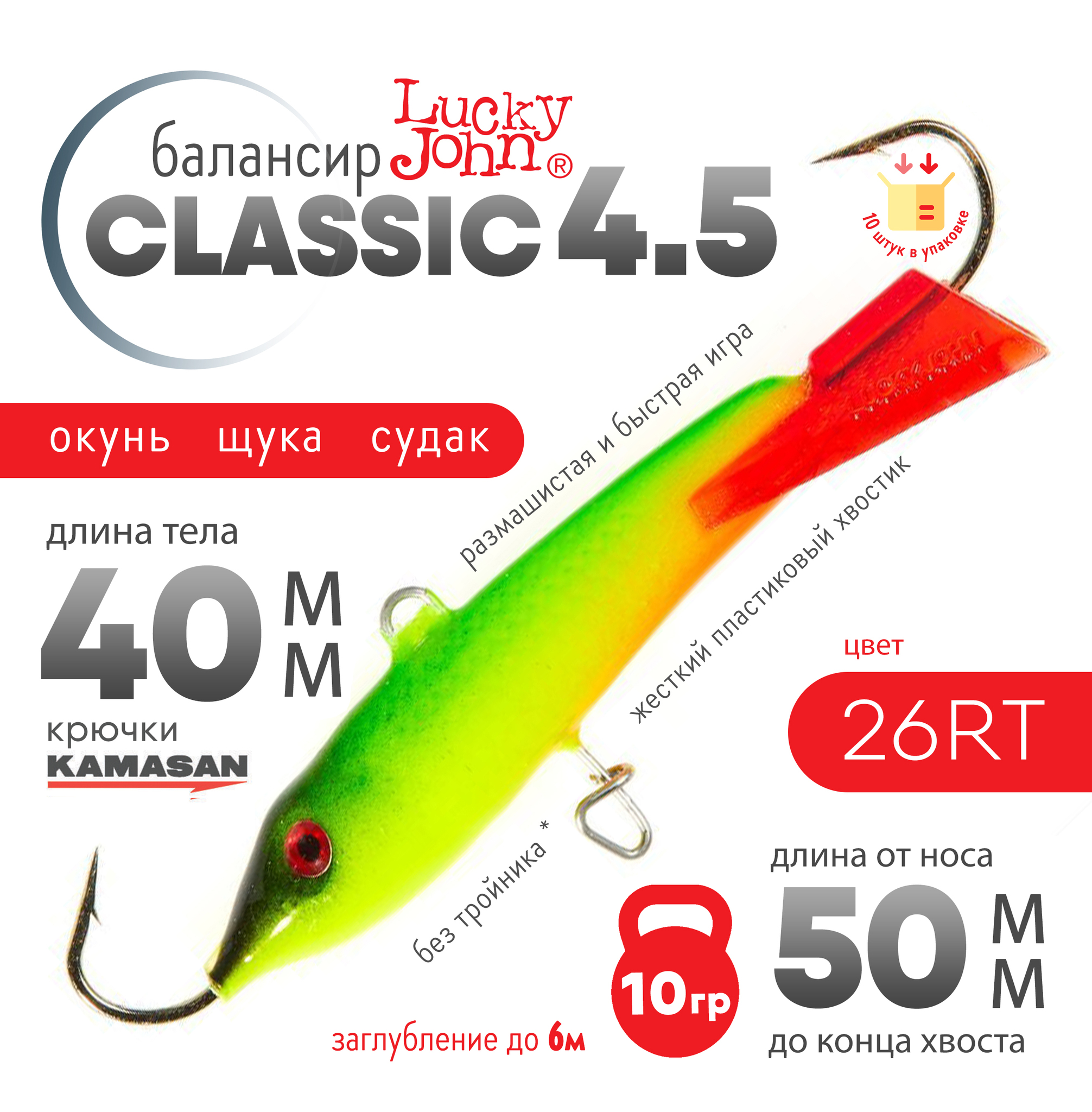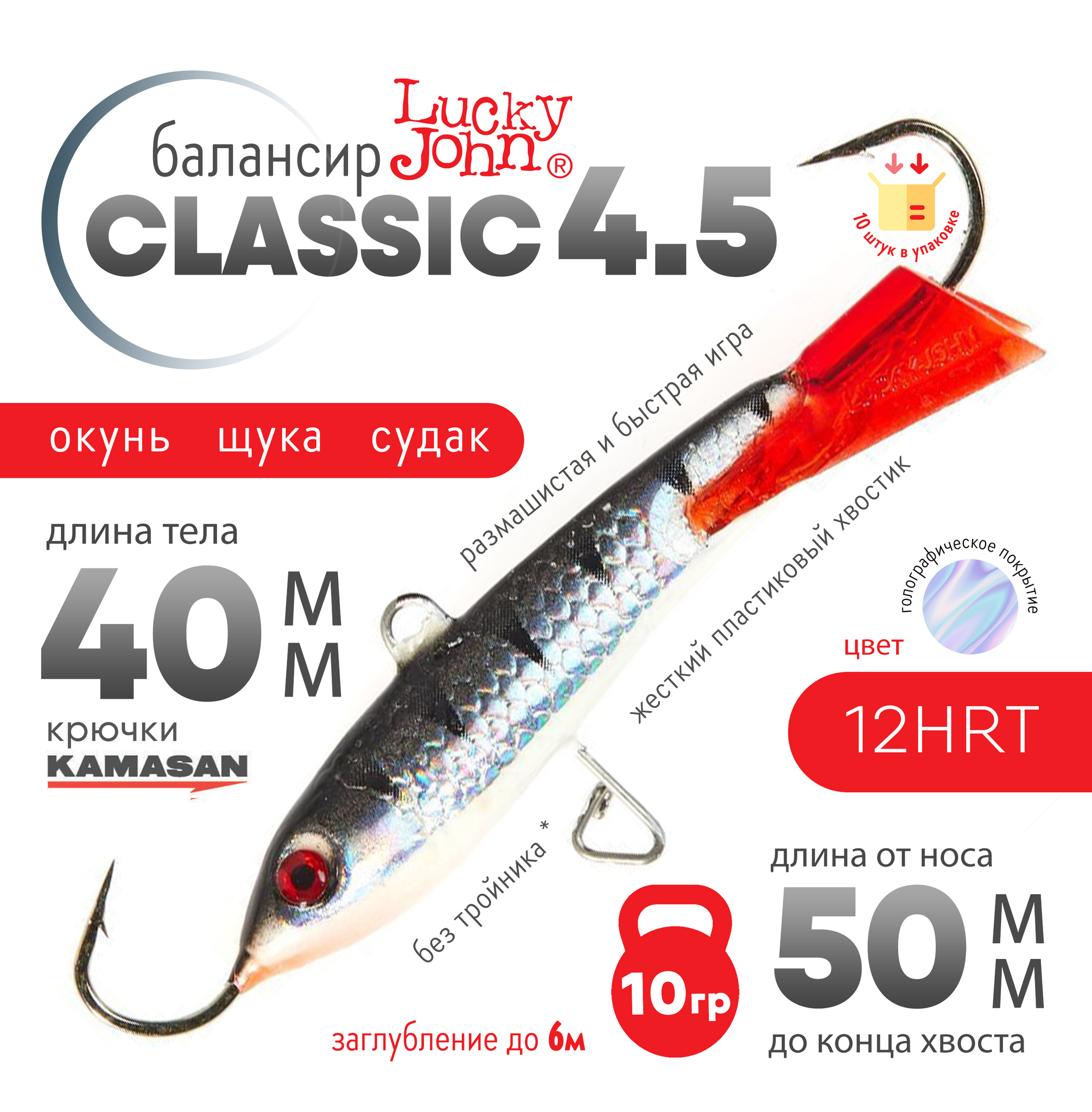 Lucky John Classic популярная модель балансиров в двух расцветках. Красное хвостовое оперение "RT" и бесцветное. Буква "H" в обозначении цвета приманки указывает на голографическое покрытие "эффект переливания цвета". Жёсткий пластиковый хвостик придаёт балансиру размашистую и быструю игру.