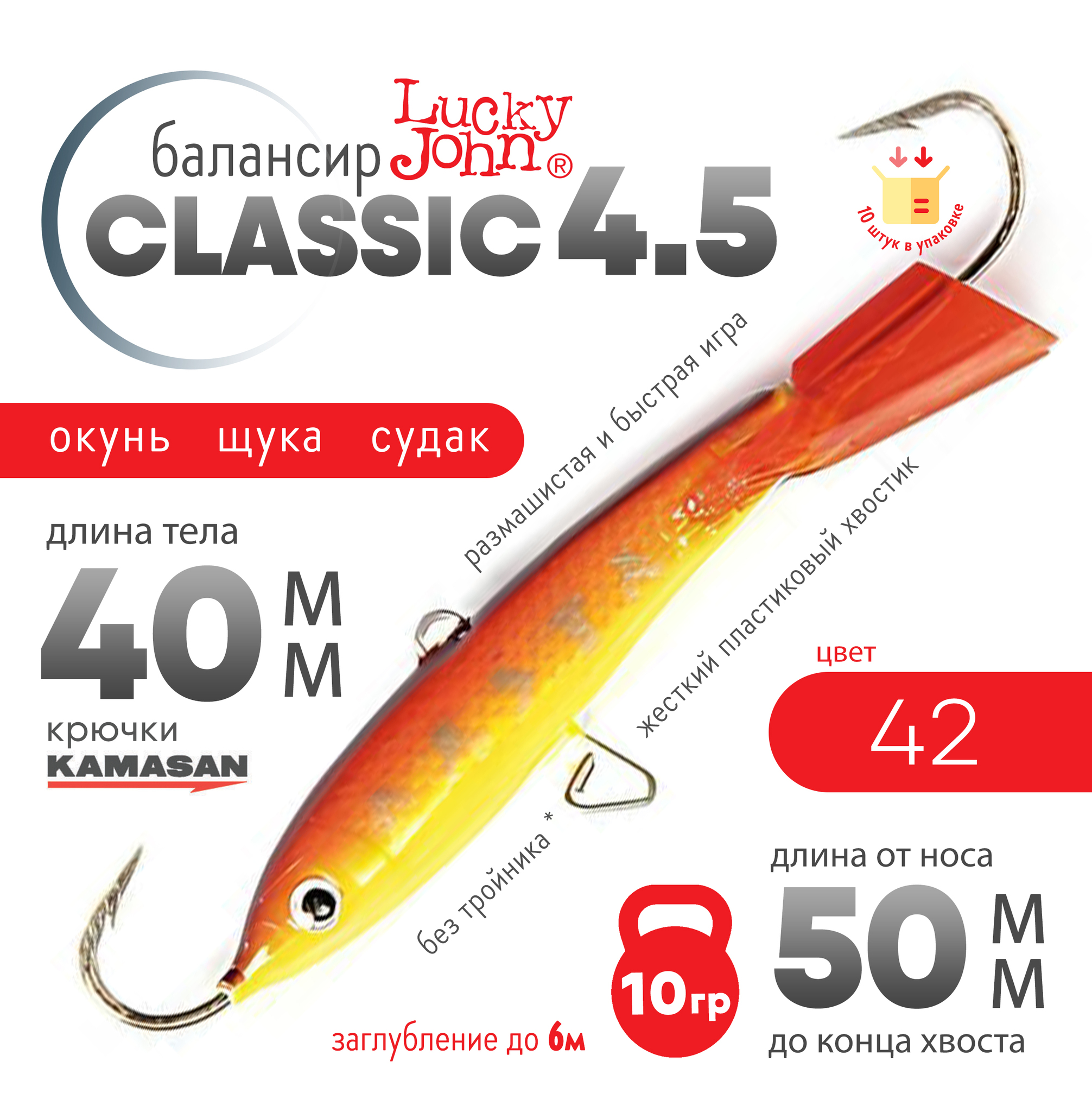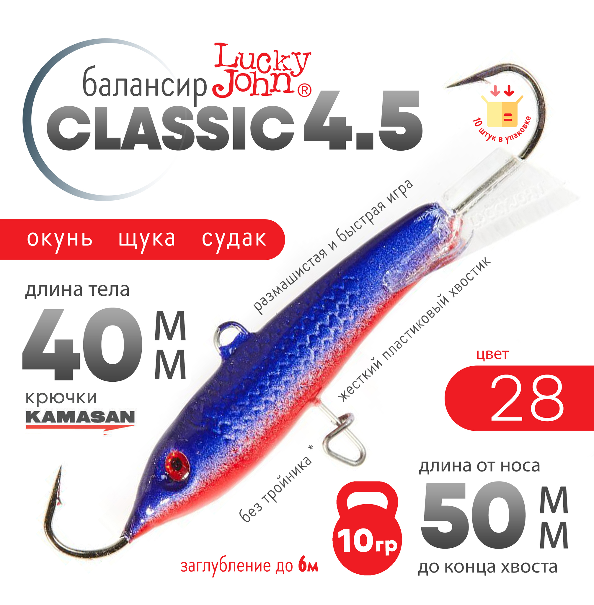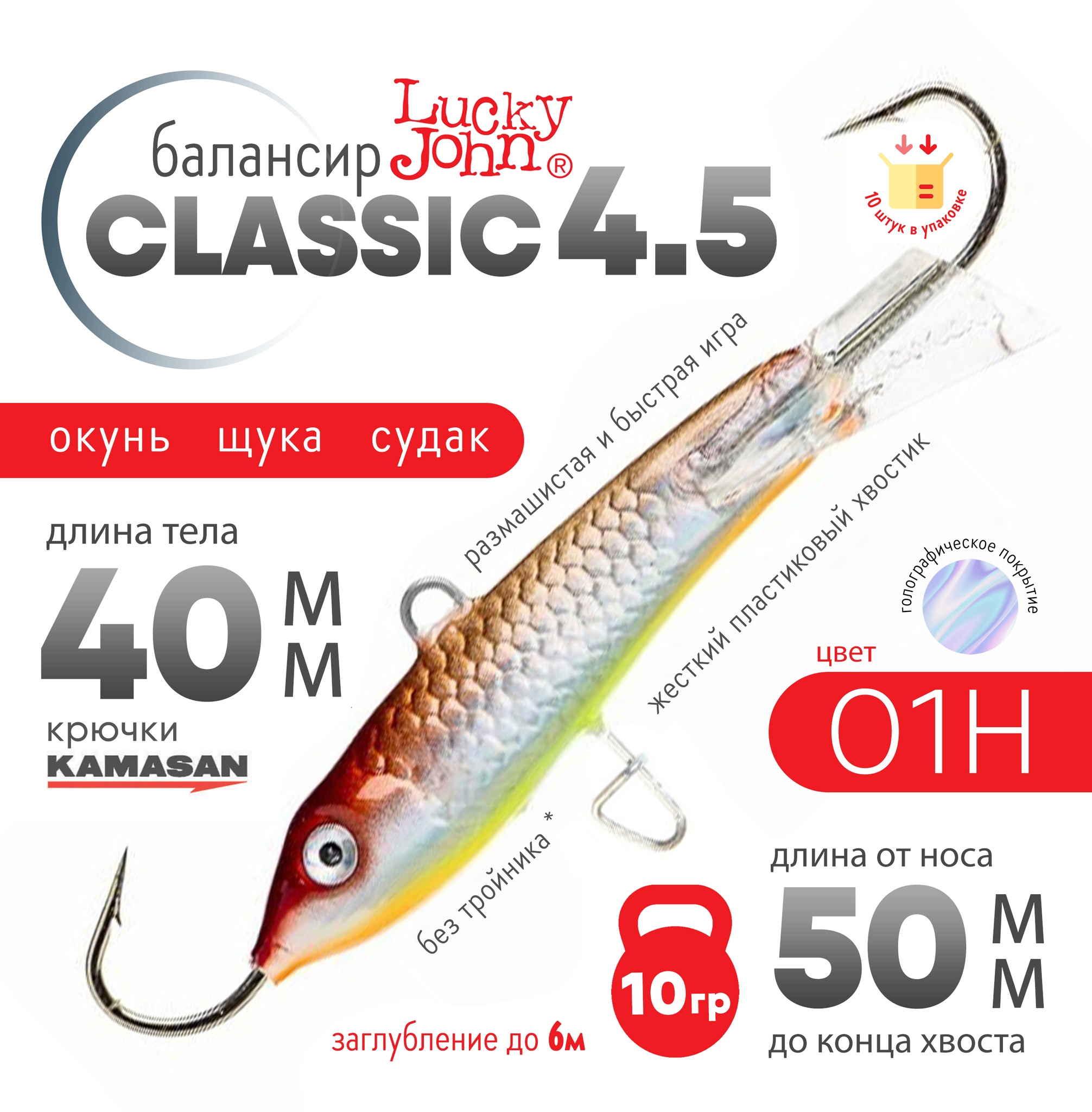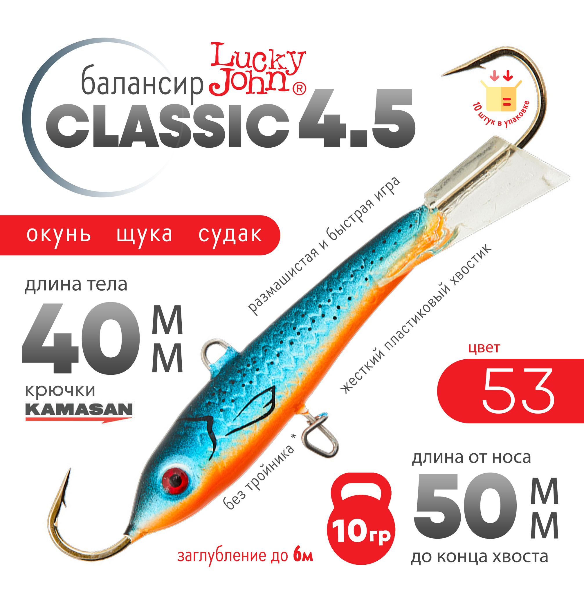 Lucky John Classic популярная модель балансиров в двух расцветках. Красное хвостовое оперение "RT" и бесцветное. Буква "H" в обозначении цвета приманки указывает на голографическое покрытие "эффект переливания цвета". Жёсткий пластиковый хвостик придаёт балансиру размашистую и быструю игру.