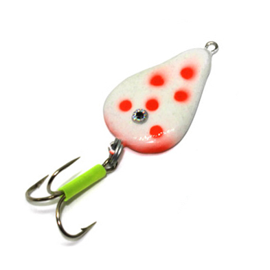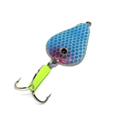 Форма блесны способствует более плавной и размеренной игре. Благодаря дизайну модификация походит на небольшую рыбку. С одной стороны есть объемный глаз. Для оснащения использован острозаточенный тройник с кембриком на цевье - такая цветная деталь является еще одним провокационным фактором.