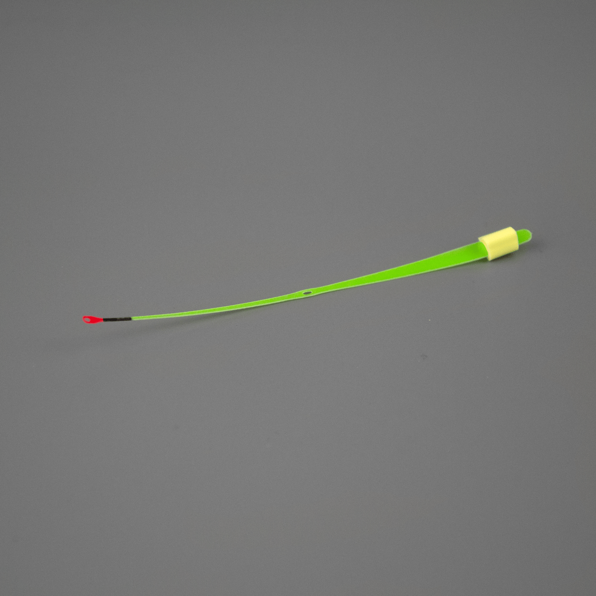 Кончик кивка – собственно сигнализатор, выполнен в форме лопатки и имеет супер яркий красный, либо лимонный цвет в исполнении "Лайм". Черная полоса подчеркивает яркую лопатку и усиливает контраст сигнализатора относительно базового цвета. Таком образом внимание рыбака акцентируется именно на кончике кивка.