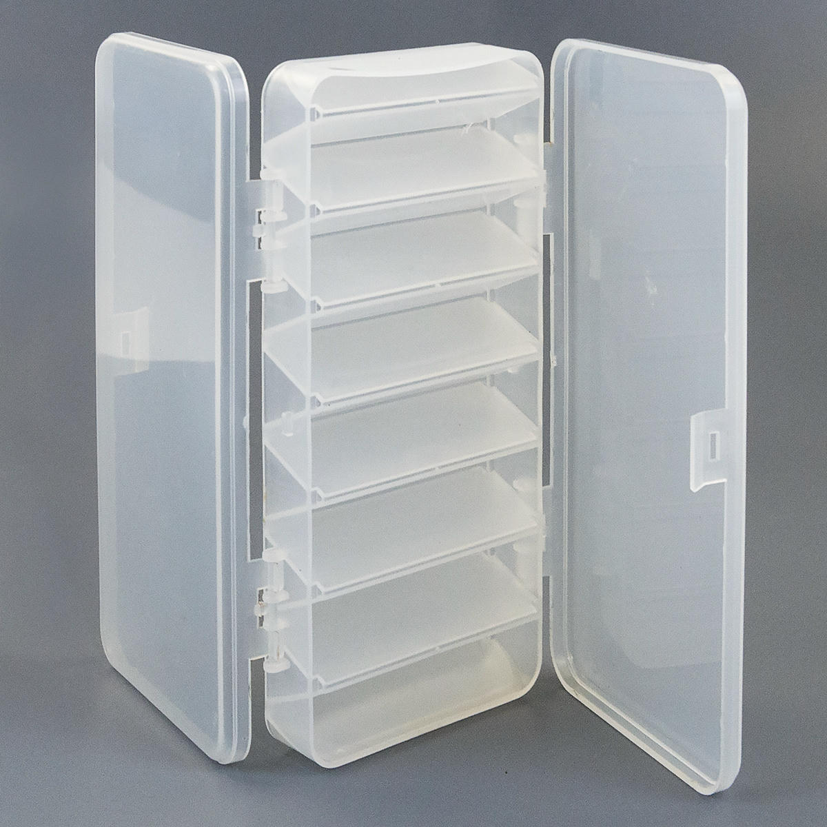 Двухсторонняя коробка для летних и зимних рыболовных приманок. Состоит из 2 секций по 7 ячеек с обеих сторон. Выполнена из высококачественного пластика. Пластик не вступает в реакцию с силиконом, поэтому в коробке можно хранить также виброхвосты и другие мягкие приманки.