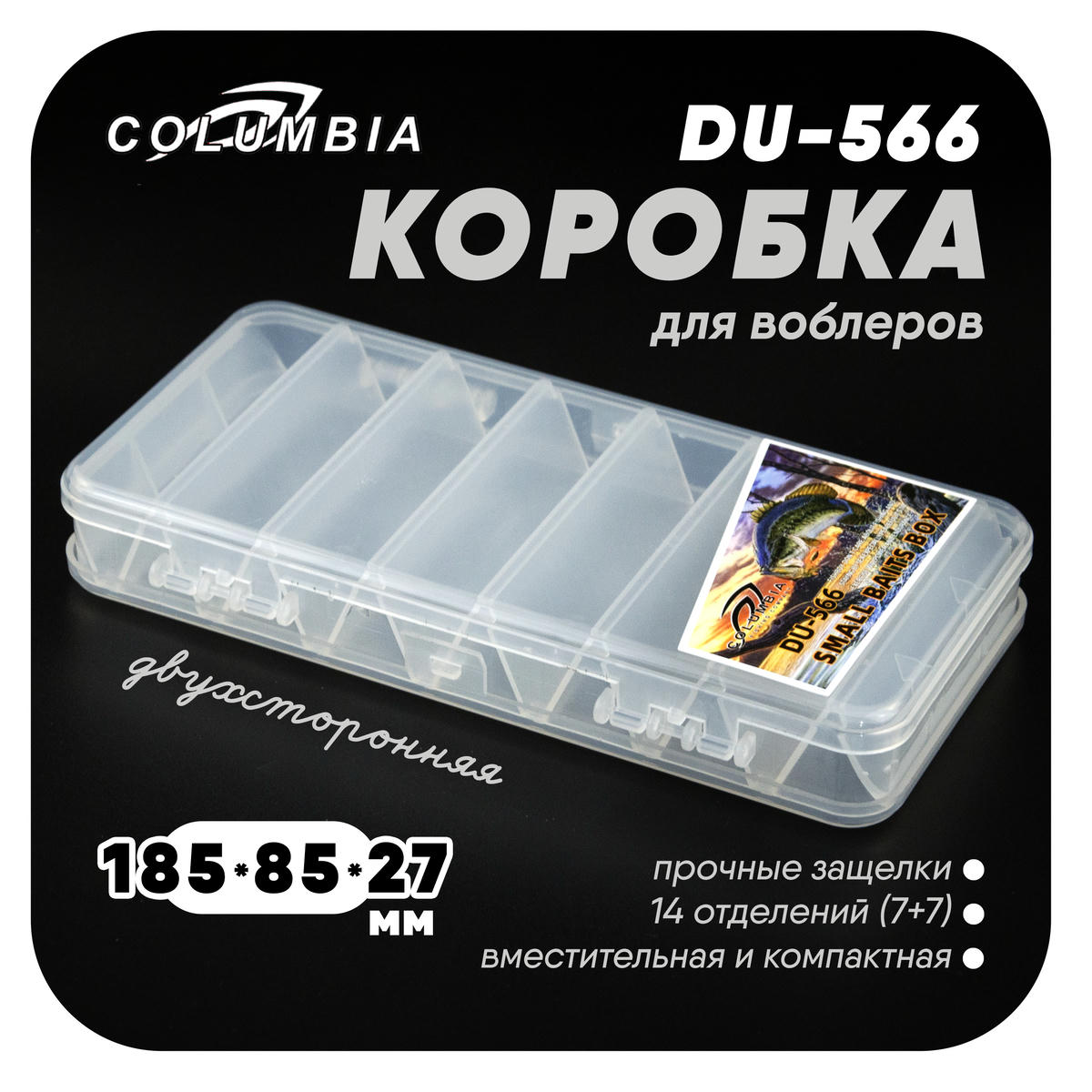 Двухсторонняя пластиковая коробка для приманок с 14 отделениями. На каждой стороне коробки по 7 отделений шириной 2 см. Изготовлена из высококачественного пластика. Отлично подойдет как для хранения небольших воблеров или балансиров так и для мягких приманок.