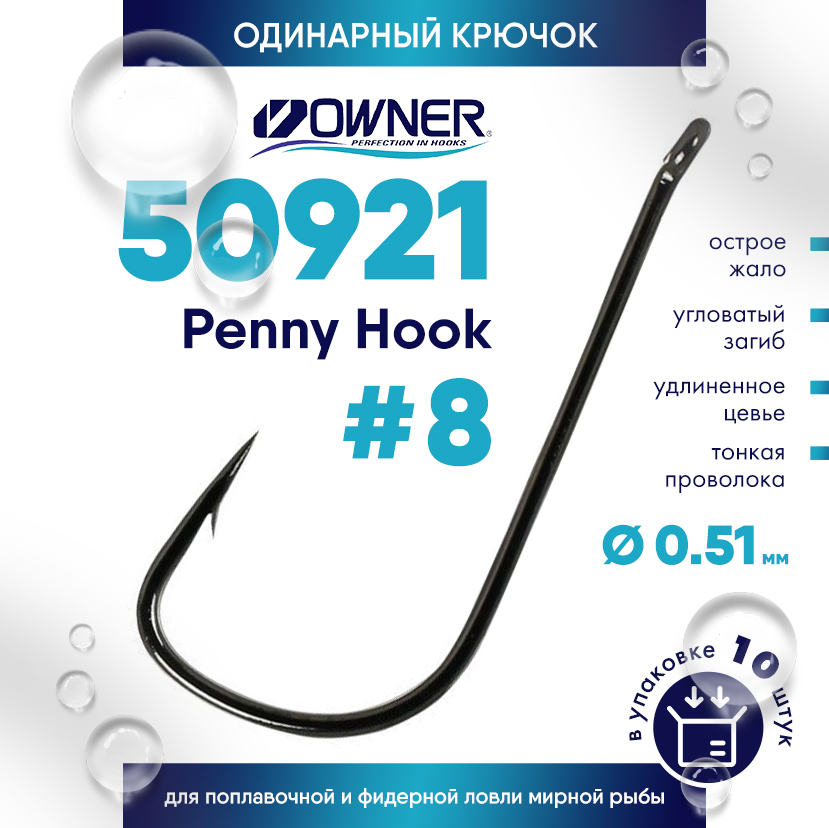 C'ultiva Penny Hook 50921 - серия крючков спортивной направленности, воплотившая достоинства (тонкая проволока, острейшее жало, маленькая изящная бородка) изделий для профессионалов с удобствами (колечко для привязки) снастей для любительской ловли. Рекомендована к использованию в поплавочной ловле на необъемные насадки как растительного, так и животного происхождения.
