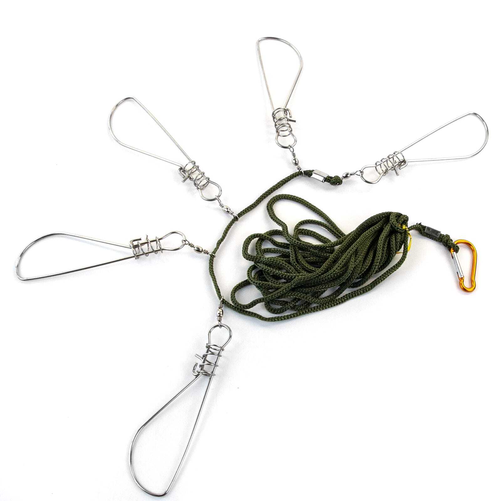Универсальный 5-тиместный кукан предназначен для сохранения рыбы живой в течение всего времени рыбалки. Изготовлен из капронового троса и 5 прочных металлических звеньев-застежек, которые установлены на трос через надежные вертлюжки. Надежный карабин позволяет быстро прикрепить кукан к прочной ветке, колышку на берегу или к лодке.
