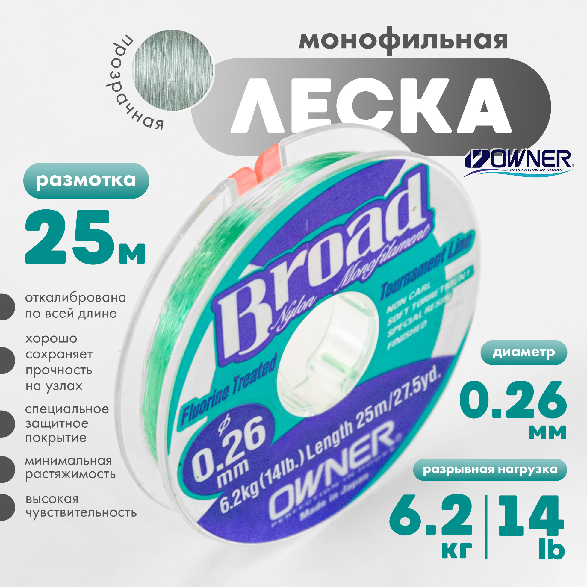 Монофил Broad - универсальная леска от фирмы Owner. Она подойдет для большинства способов ловли, например, для спиннинга, поплавочной ловли или донных оснасток. Она прозрачна и невидима в воде, благодаря чему не отпугивает осторожную рыбу. Леска отличается высокими показателями разрывной нагрузки, хорошо сохраняет прочность на узлах. Специальное защитное покрытие повышает ее антиабразивные качества и износостойкость, за счет чего леска хорошо подходит для донных и фидерных снастей. Производитель утверждает, что леска Owner Broad хорошо калибрована и имеет точный выверенный диаметр по всей длине. Также к ее достоинствам относится минимальная растяжимость и высокая чувствительность.