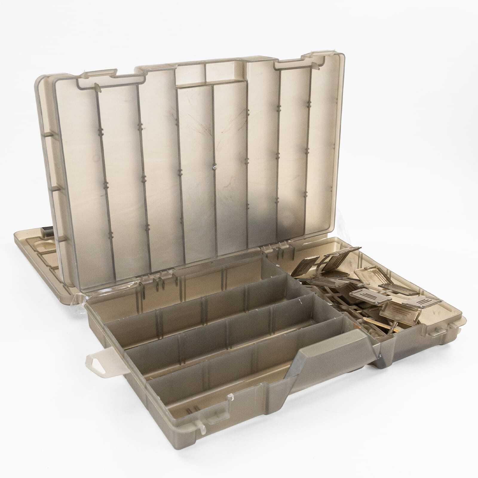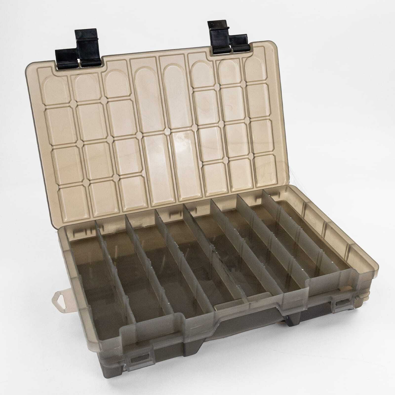 В нижнем ярусе органайзера есть 4 ячейки габаритами 21*4.8*3.5 см и 1 ячейка 19.8*10.6*3.5. В комплекте к нижнему отделу прилагается 12 съемных разделителей. Его также можно использовать как для мелочей, так и для воблеров разной величины, мягких приманок и инструментов, например, ножницы, иглы и антизакручиватели.