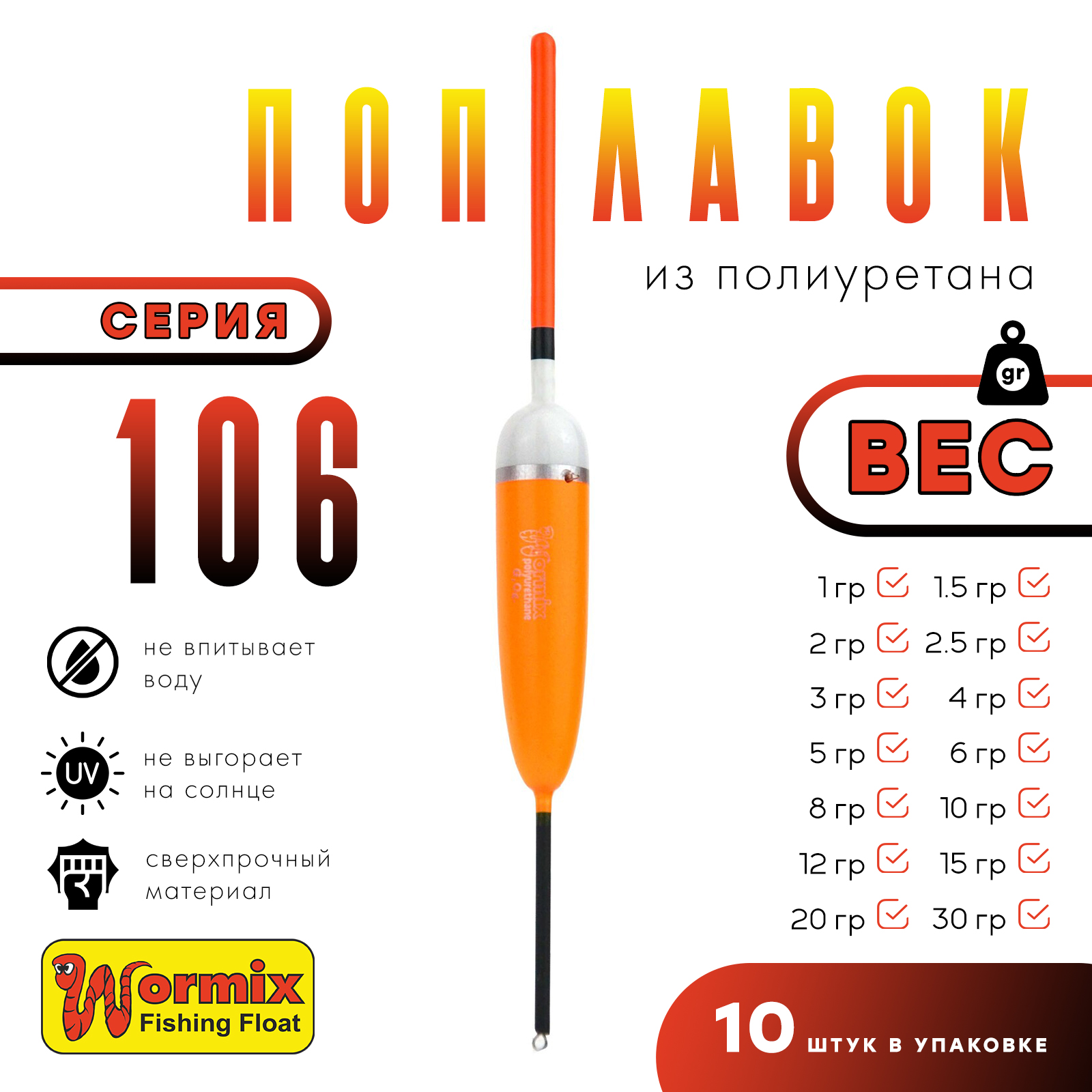 Wormix 106 - довольно обширная линейка, в ней представлены 14 размеров: 1, 1,5, 2, 2,5, 3, 4, 5, 6, 8, 10, 12, 15, 20, и 30. Это необходимо, чтобы вы могли подобрать поплавок для каждого вида водоемов - рек, озер и прудов с разным течением и небольшой глубиной.