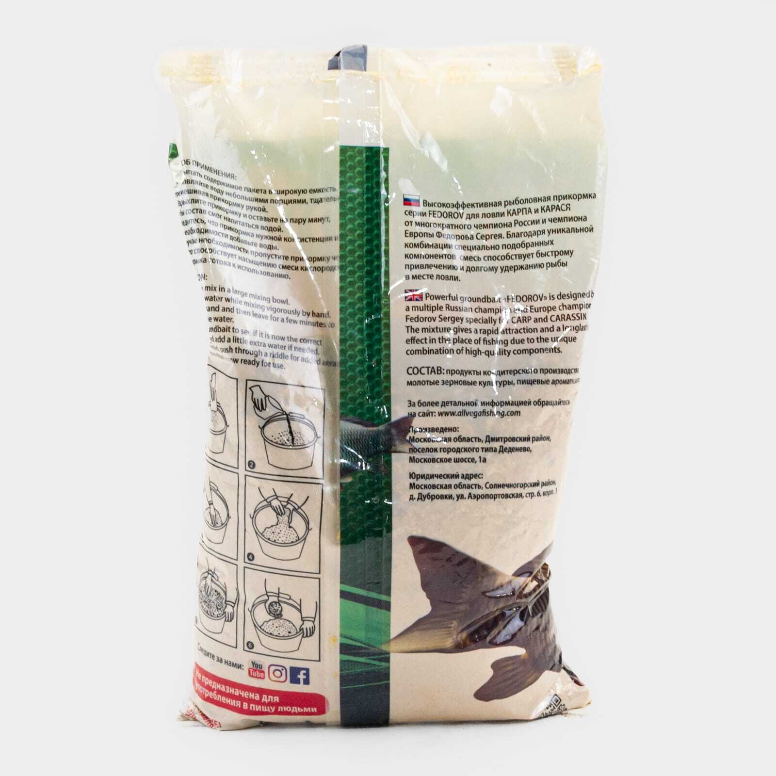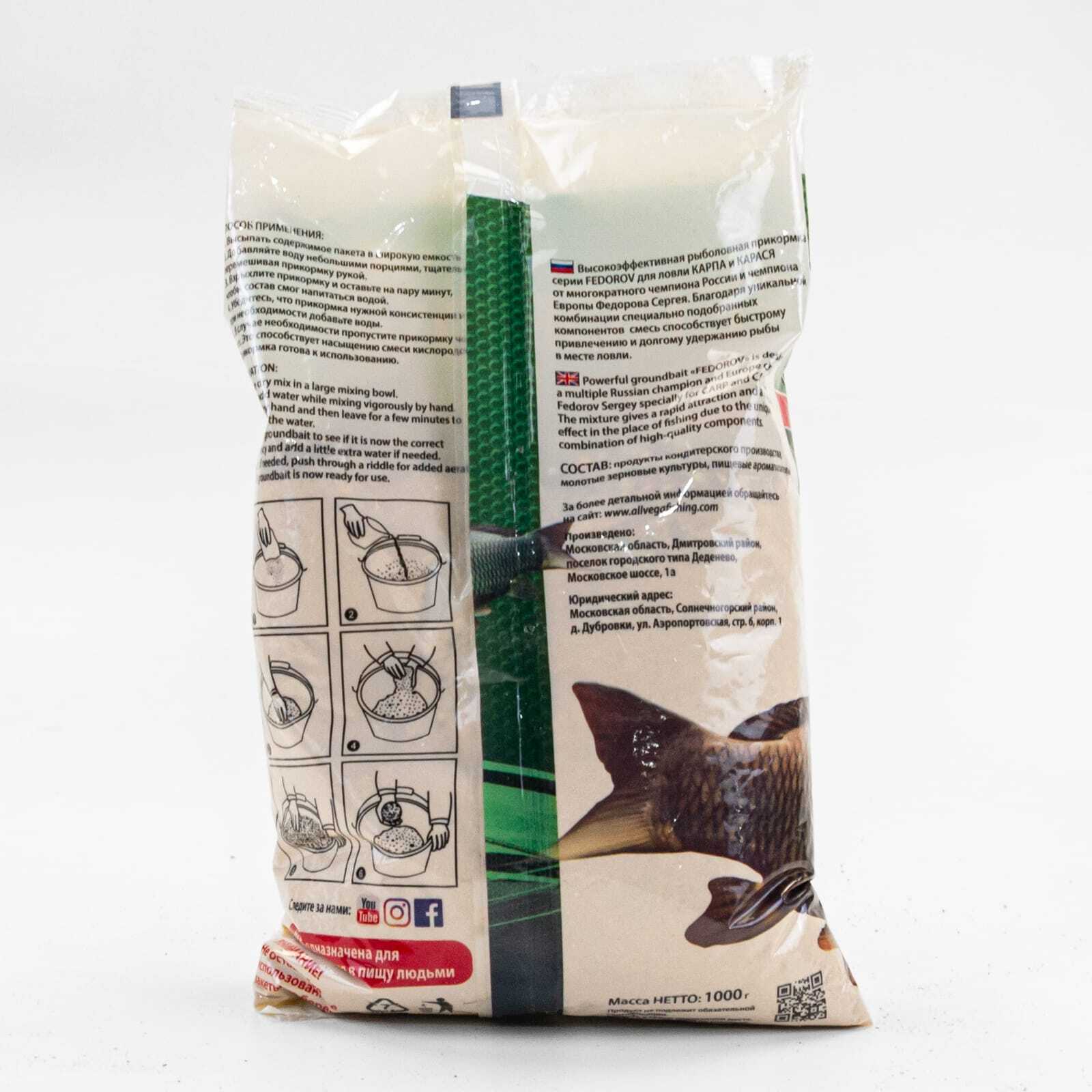 - Основа: высококачественная растительная смесь, включающая молотые зерновые культуры, сухое молоко, рыбную муку и прочие компоненты, привлекающие рыбу.