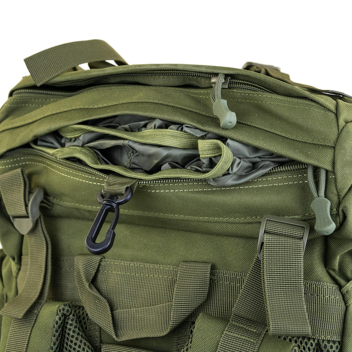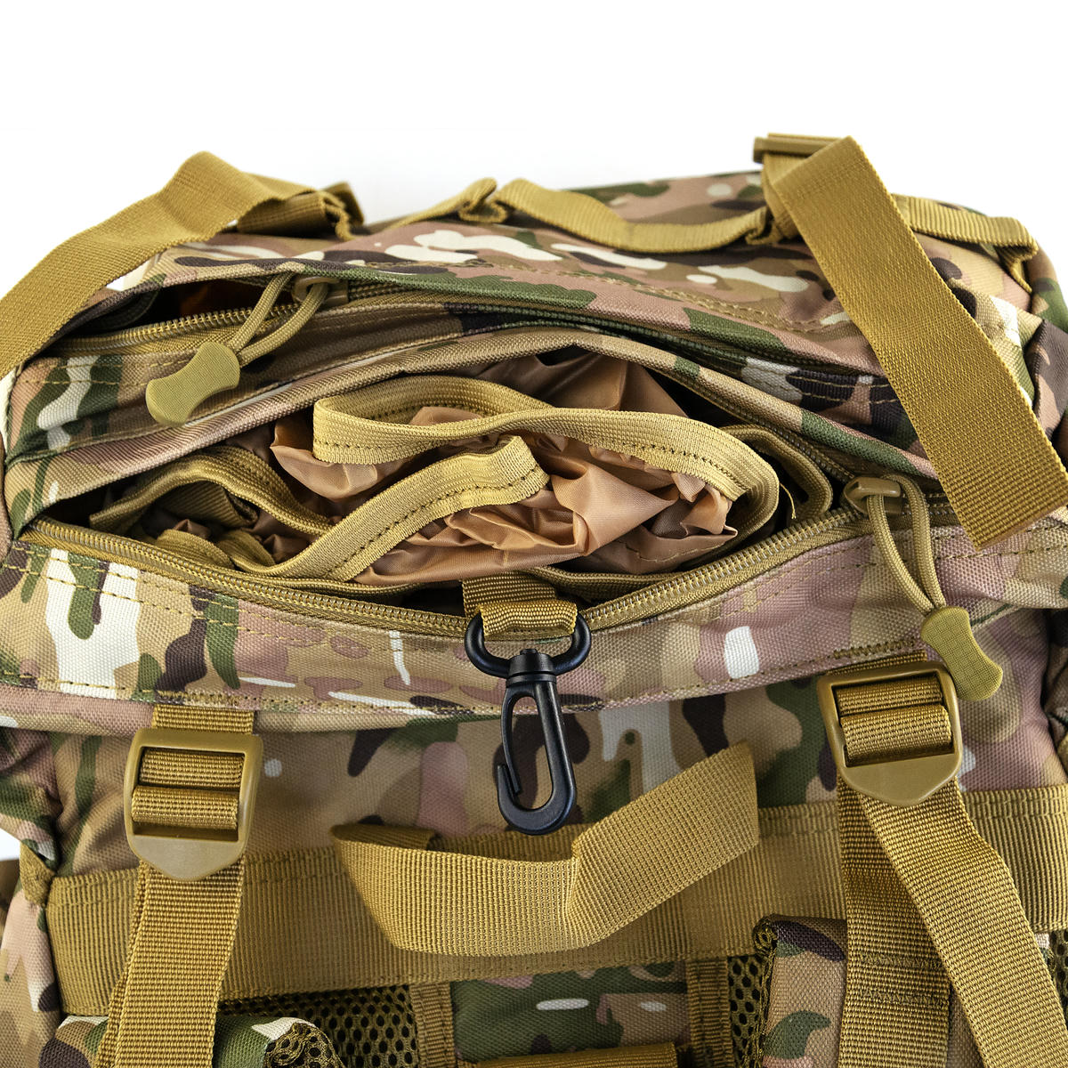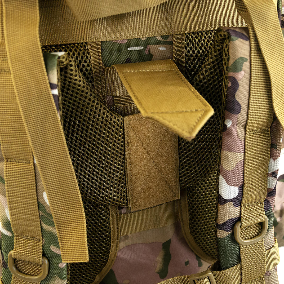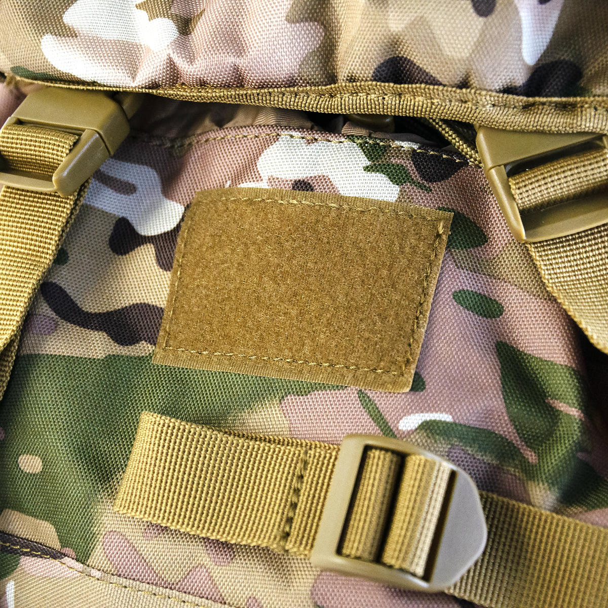 На верхней части есть «липучка» для крепления патчей или шевронов. Компрессионные стропы позволяют утянуть объем рюкзака, если он заполнен не полностью.