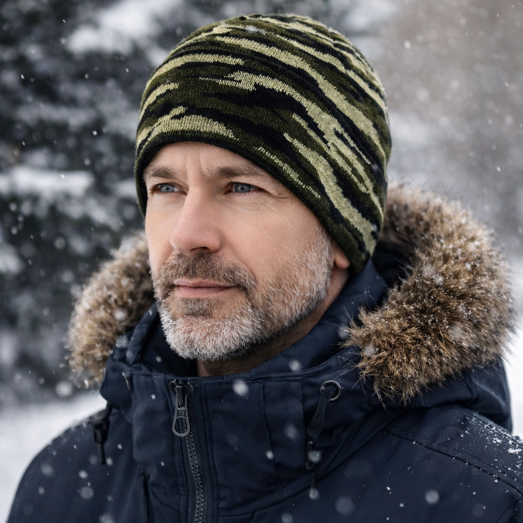 Универсальная зимняя шапка в классическом стиле. Благодаря двойному слою (плотная вязка + мягкий флис) идеально подходит для суровых зимних условий, охоты, рыбалки и повседневной носки.
