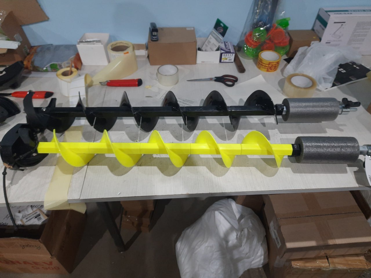 В комплекте идут две сменные пластиковые головы: одна со сферическими ножами по типу "моровских" (входят в комплект!), вторая рассчитана под ножи Тонар Айсберг (не входят в комплект!). Также шнек имеет направляющее сверло, тем самым без напряга позволяет делать сдвоенные лунки.
