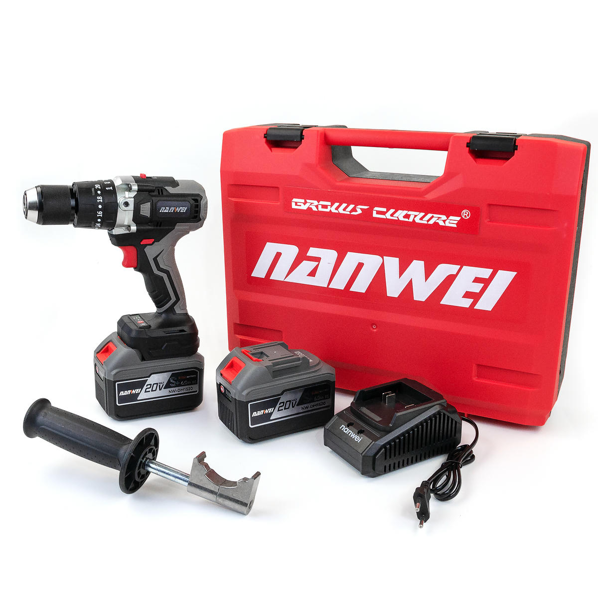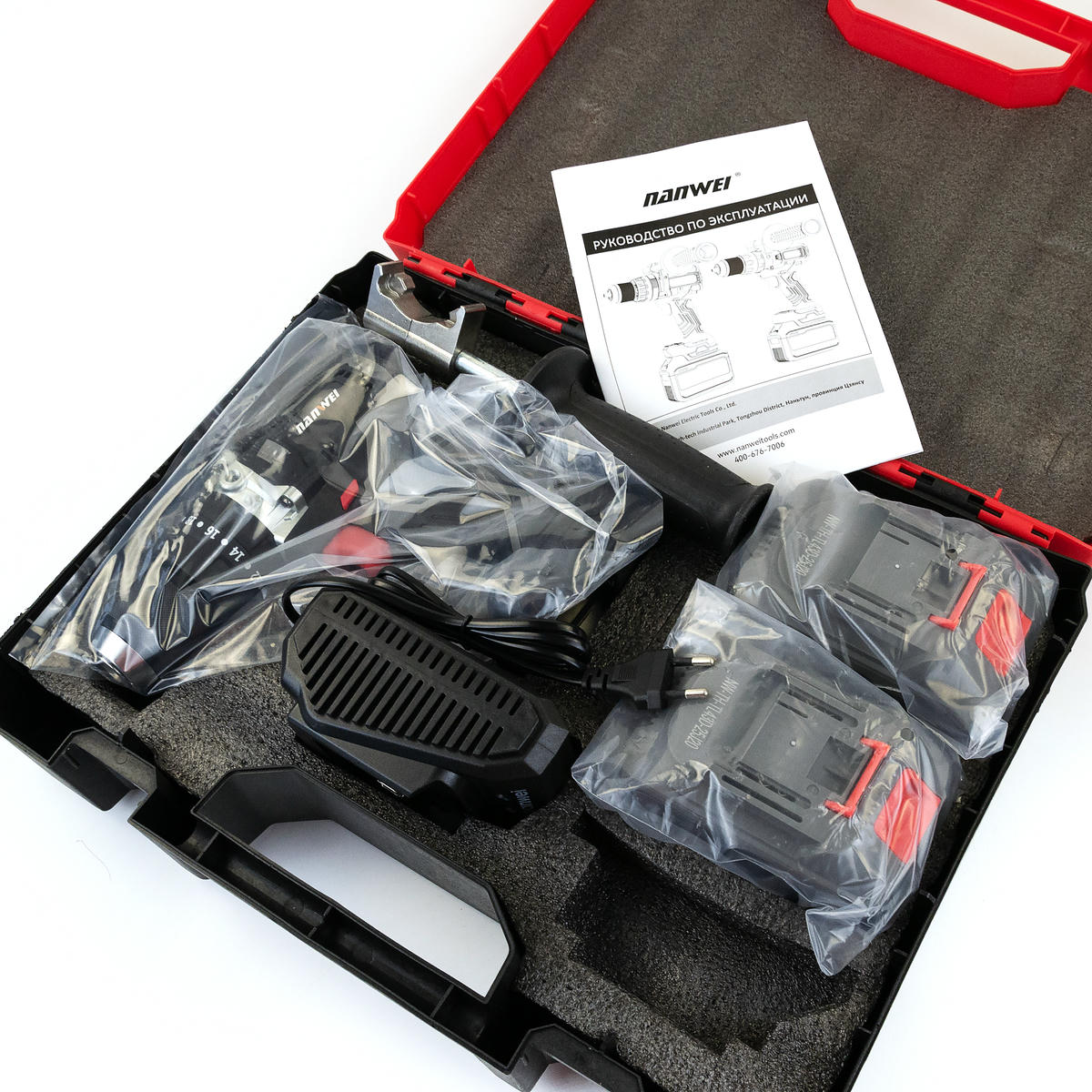 В комплекте: шуруповерт, кейс, зарядное устройство, две аккумуляторных батареи по 6Аh, съёмная упорная ручка.