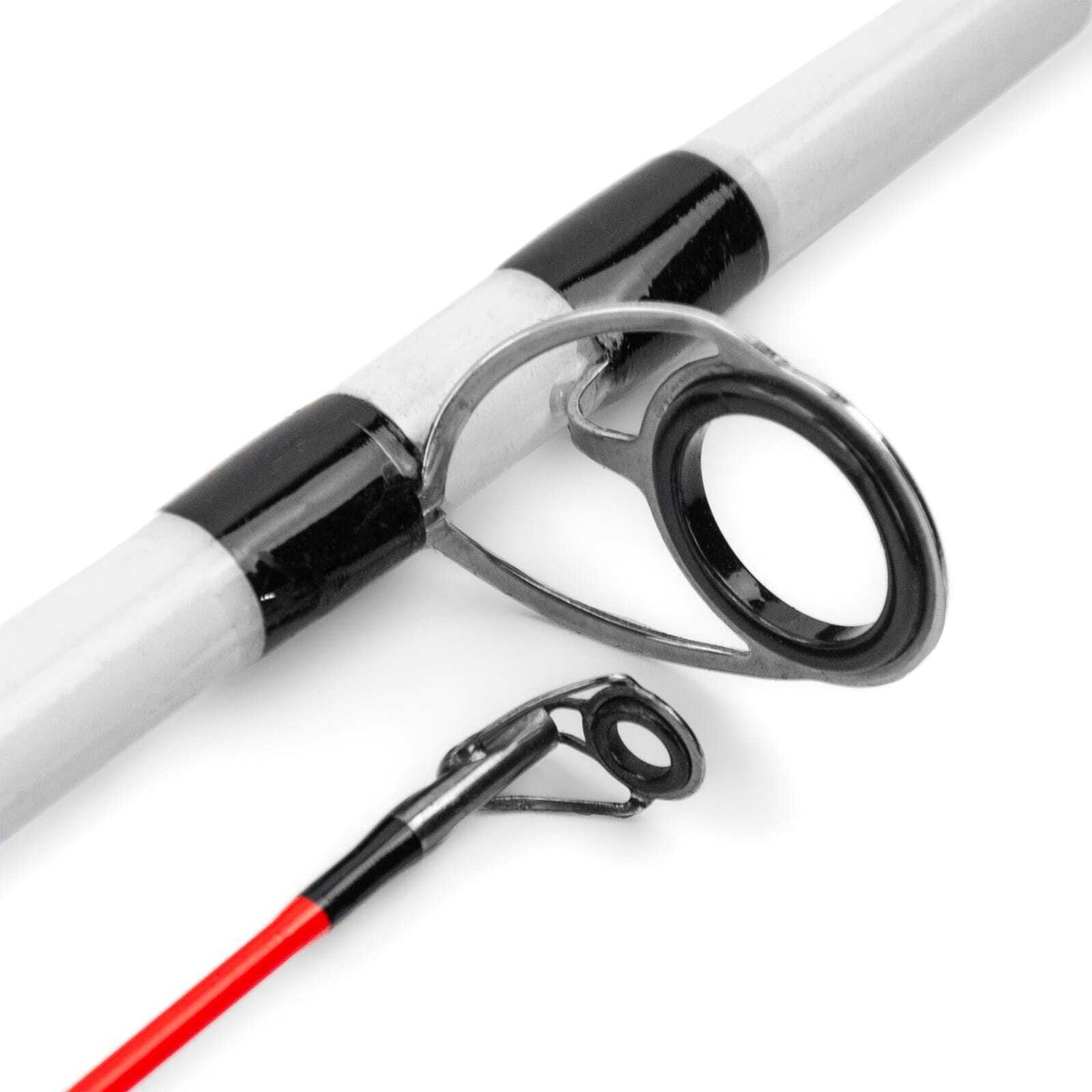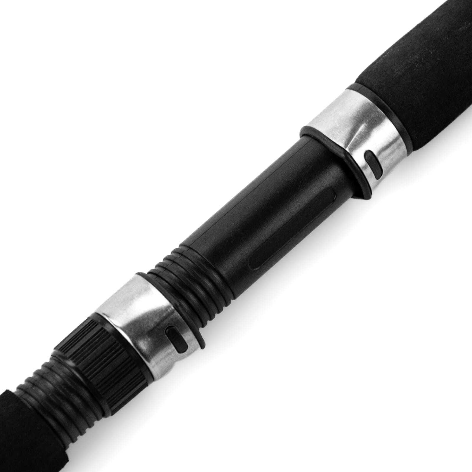 Удилище имеет штекерную конструкцию, то есть в разложенном состоянии снасть разделена на 2 части, а на время рыбалки части вставляются друг в друга, складываясь в готовый инструмент для ловли рыбы.