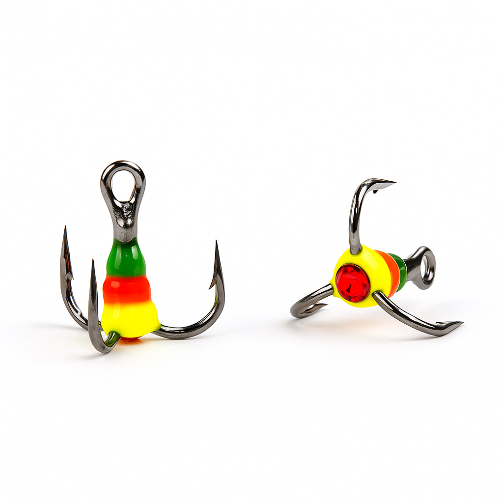 Острые и прочные тройники отлично подойдут для оснащения зимних приманок. с Обливная капля из разноцветной эпоксидной смолы служит как дополнительно привлекающий элемент, особенно при неактивном клёве.