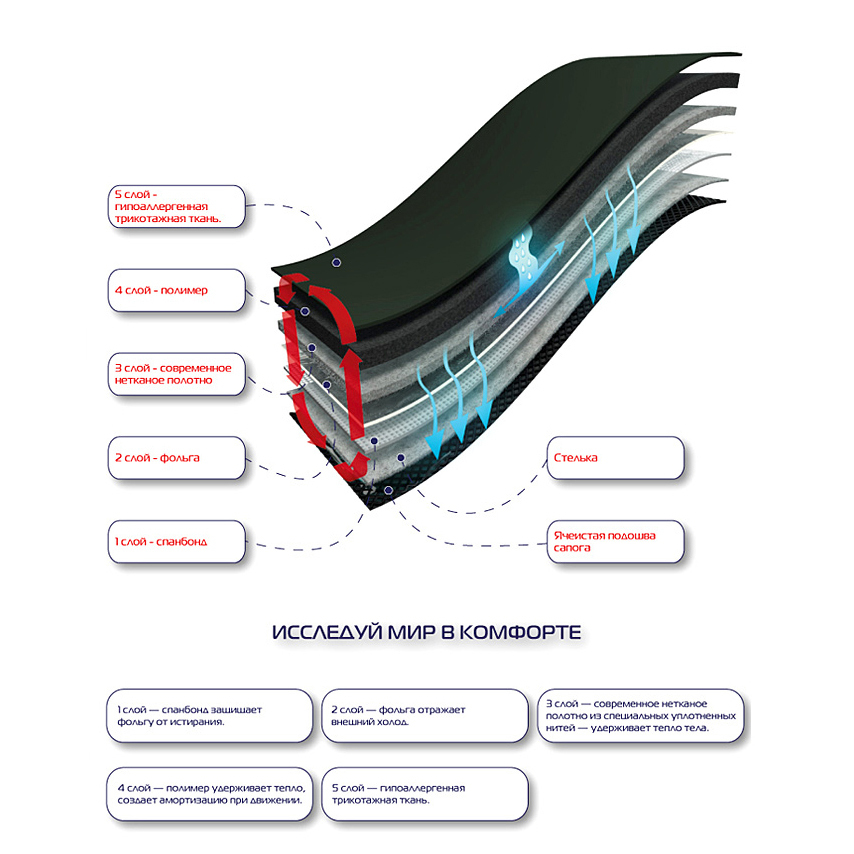 4 слой - полимер, удерживает тепло и создает амортизацию при движении