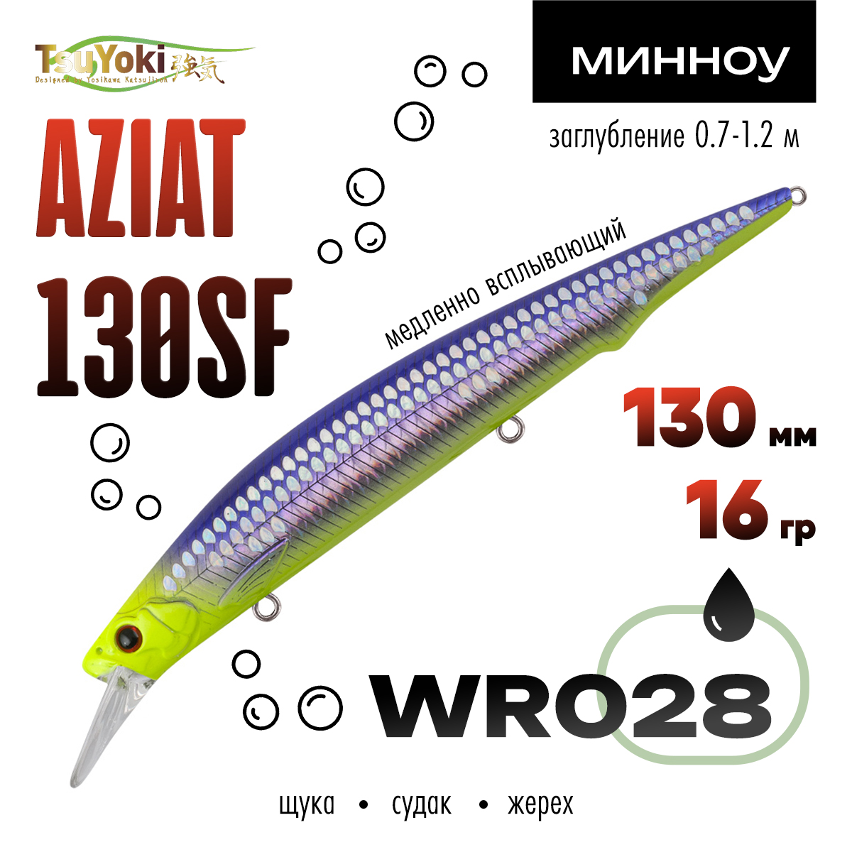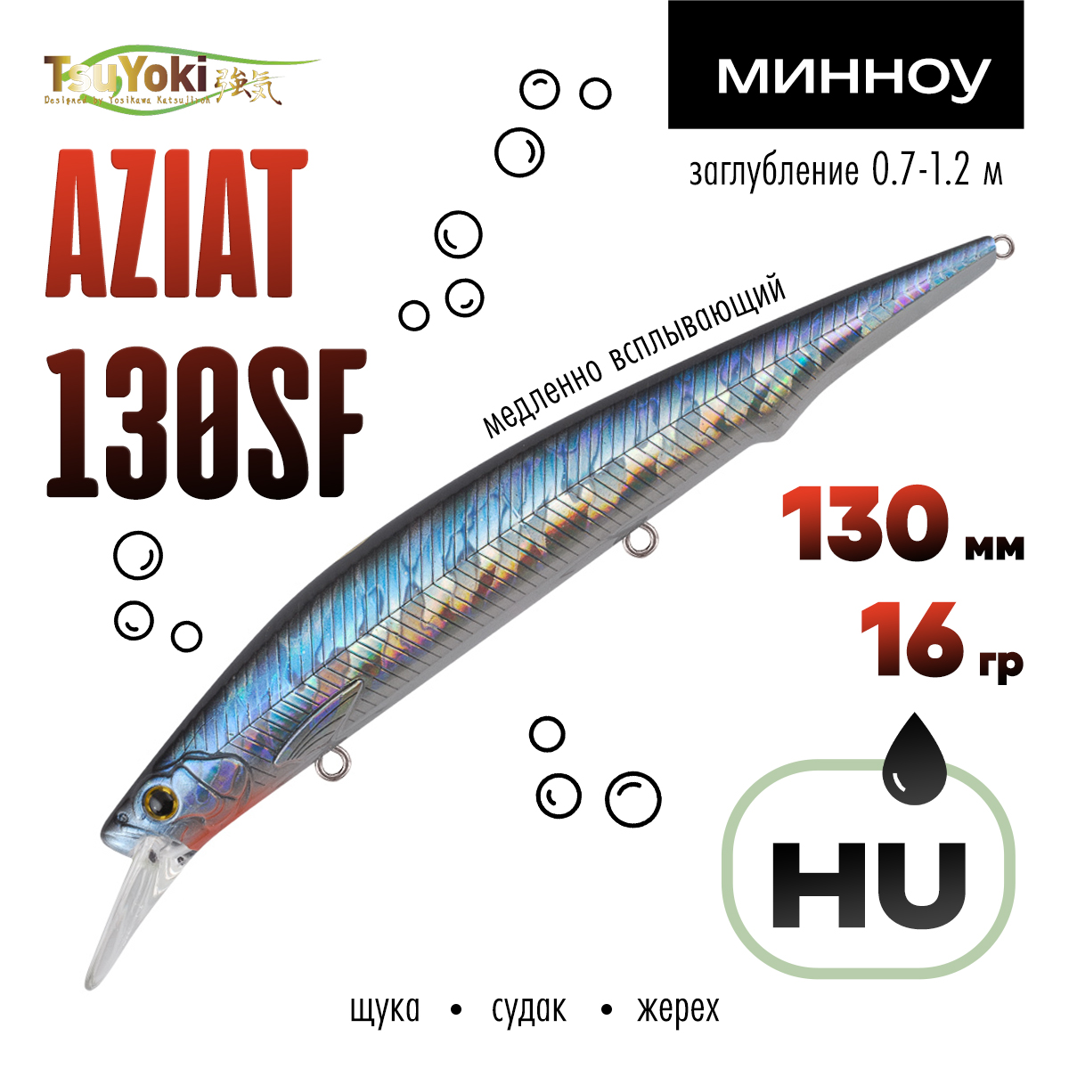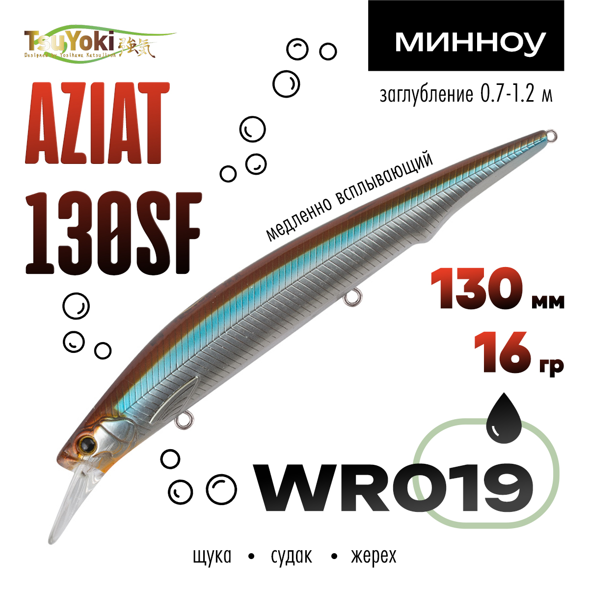 AZIAT 130SF – крупный воблер-минноу узкой вытянутой формы, плавно сужающейся к хвосту приманки. По бокам воблера имеются две разделенные боковой линией рельефные фактуры поверхности в виде косых насечек. Головная часть воблера рельефно имитирует жаберные крышки рыбки, а 3D глаза дополняют реалистичность дизайна всей приманки. Встроенная система дальнего заброса одновременно является системой баланса приманки и шумовой камерой. Воблер достаточно громкий, при проводке привлекает рыбу не только своей игрой, но и выраженным шумовым сопровождением.