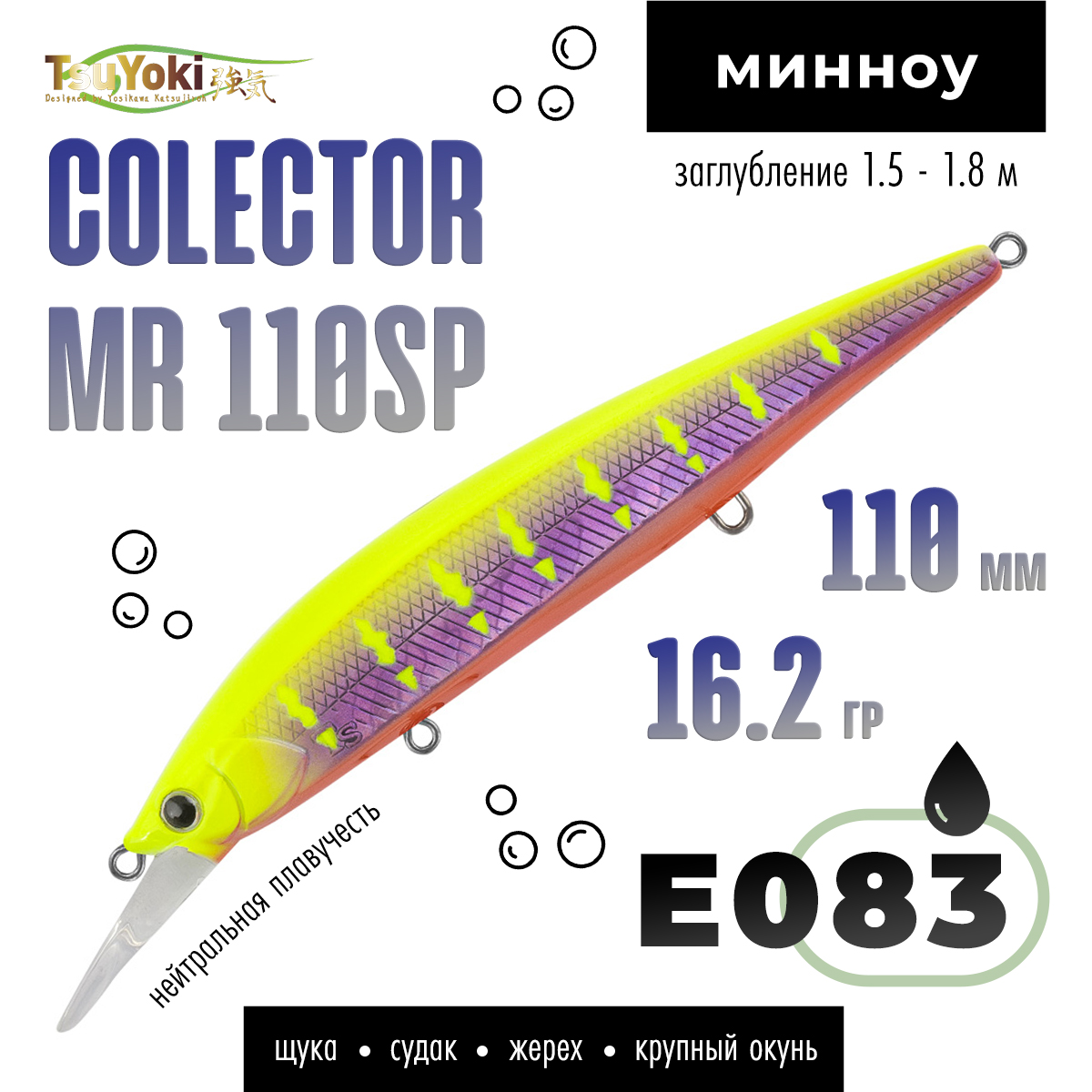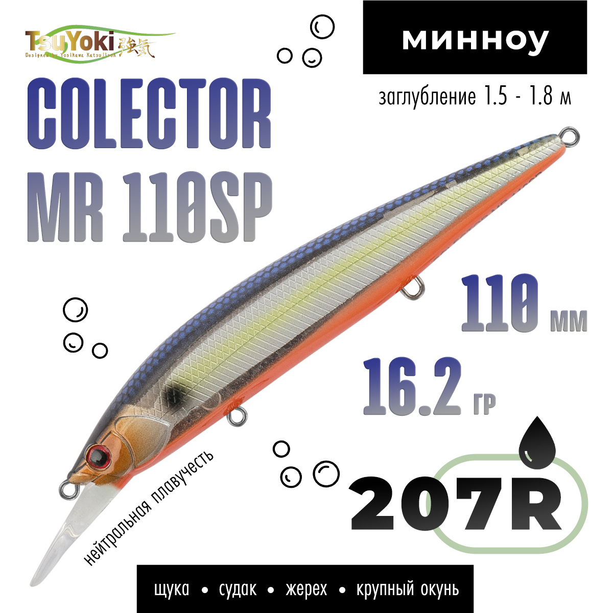 Заброс и анимация: COLECTOR MR 110SP является дальнобойной приманкой. При тестах воблер улетал к отметкам 40-45 метров. Дальний заброс и стабильное поведение приманки в полете позволяют использовать COLECTOR MR 110SP как воблер-поисковик, способный за короткий период облавливать большие площади акватории.
