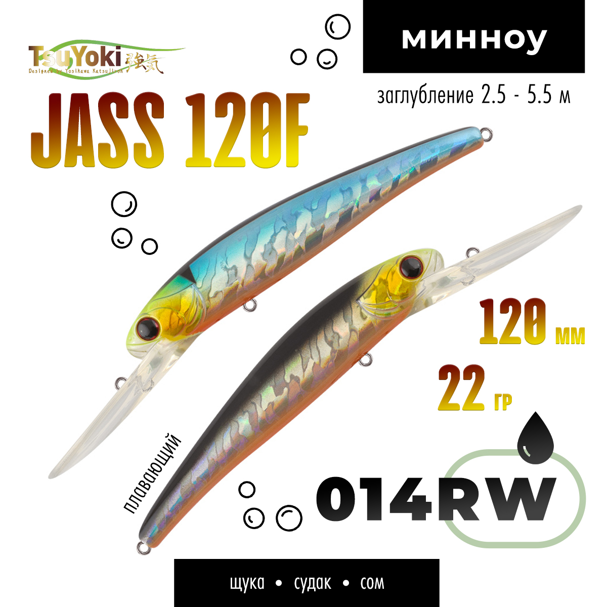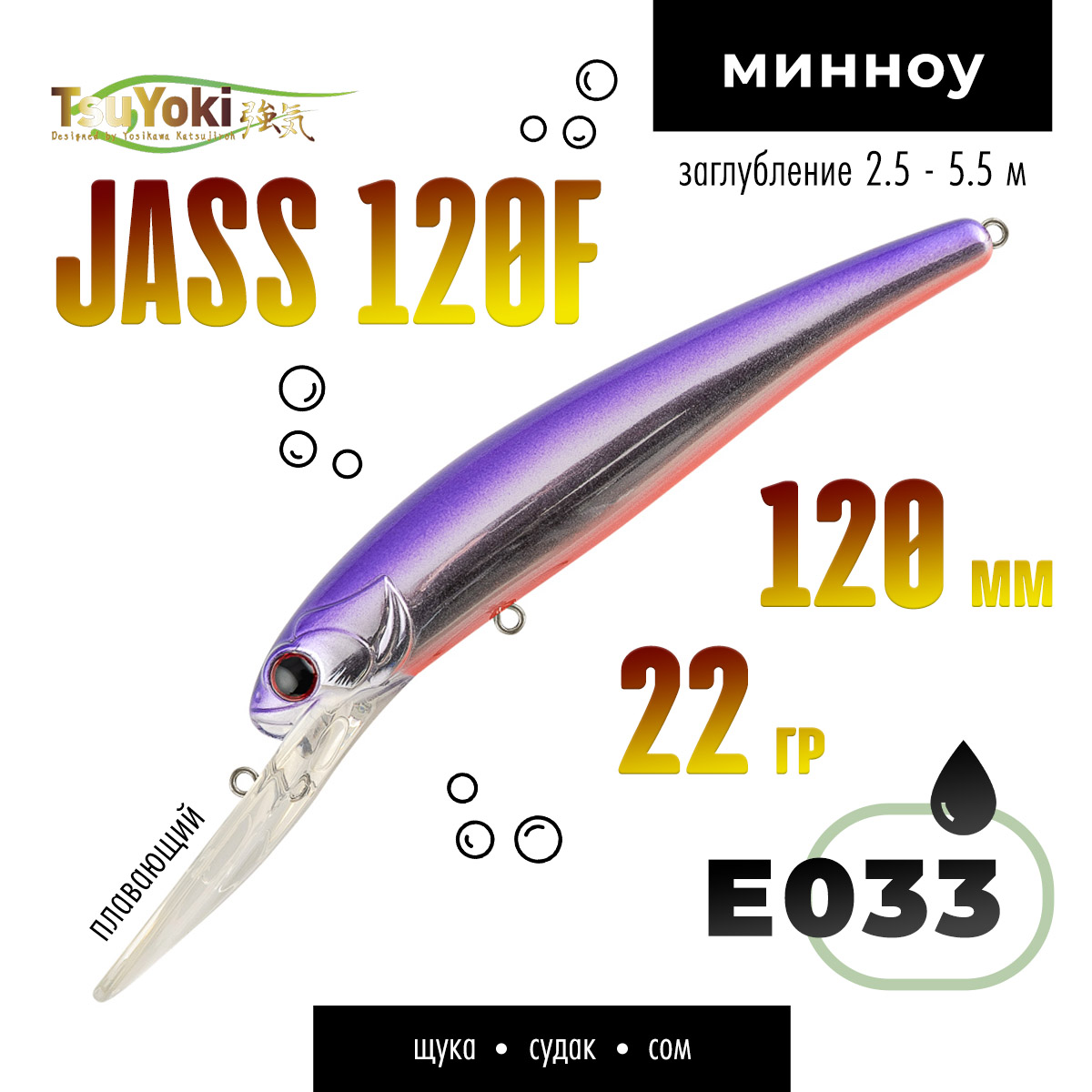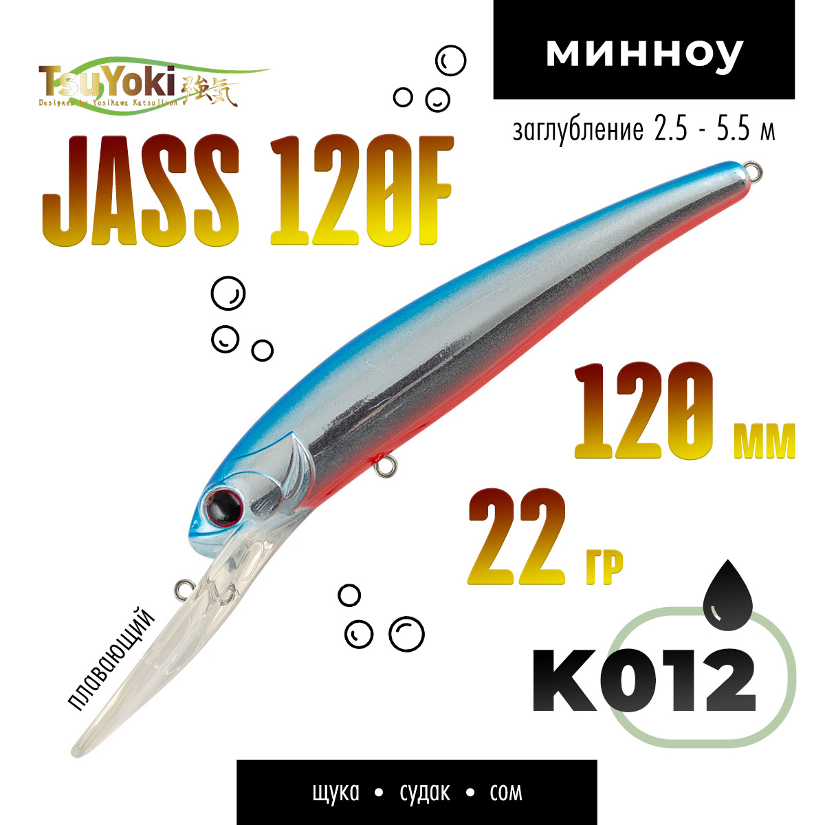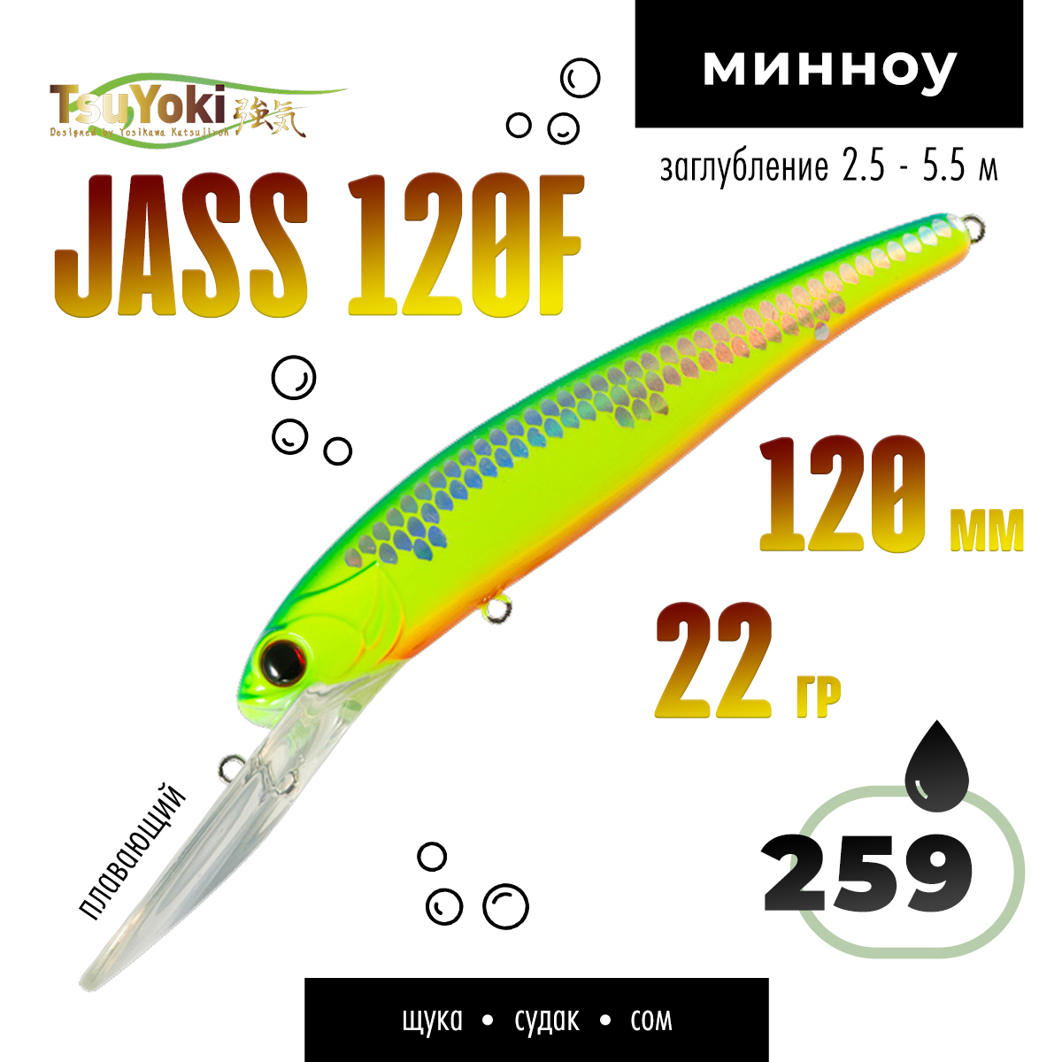 Воблер TsuYoki JASS 120F предназначен для ловли такой трофейной рыбы как судак, щука, сом методом троллинг.