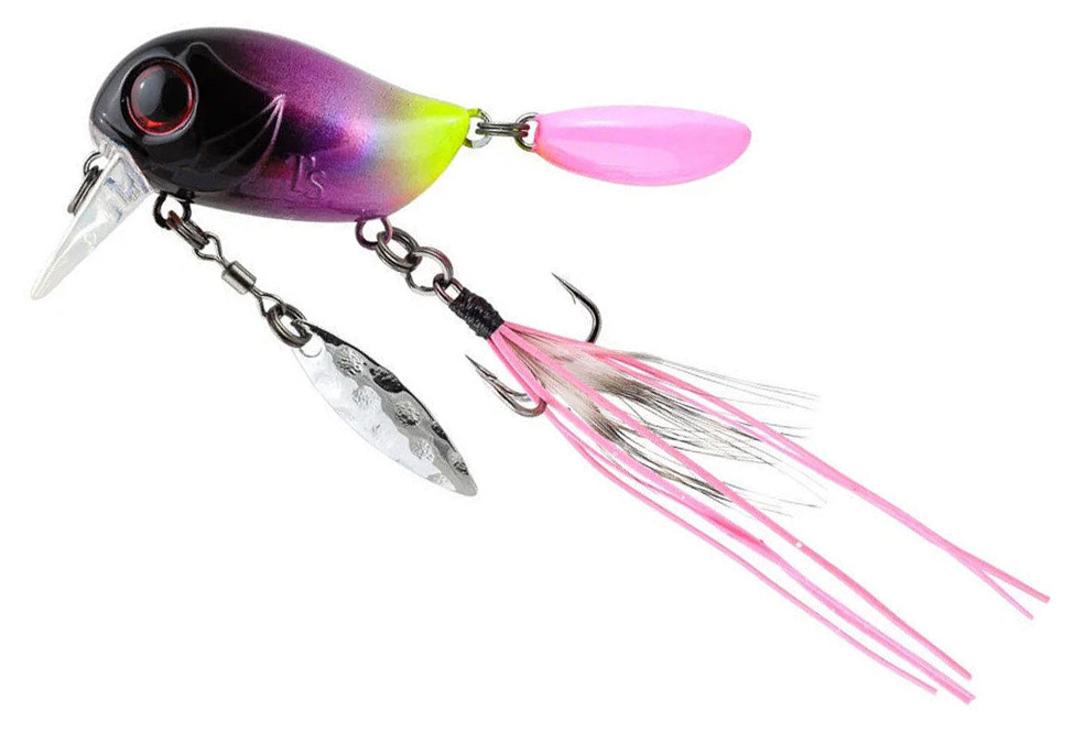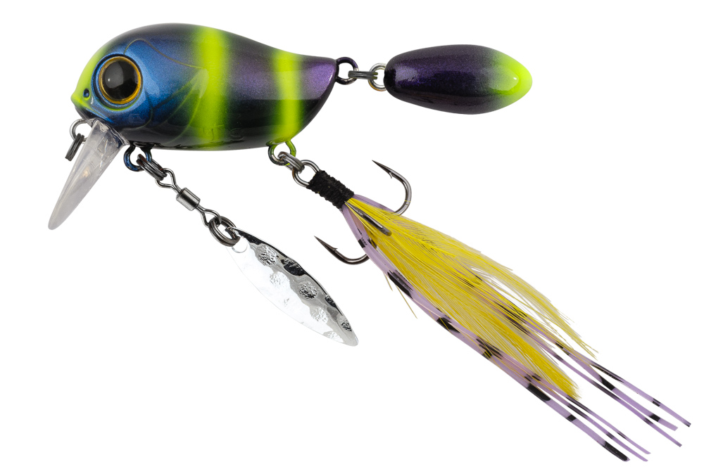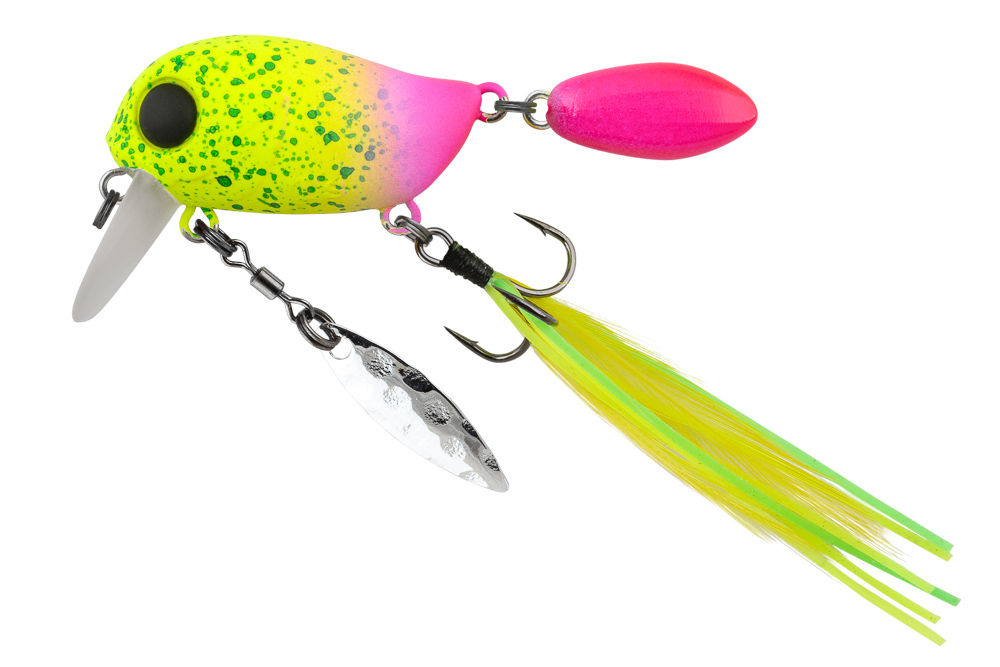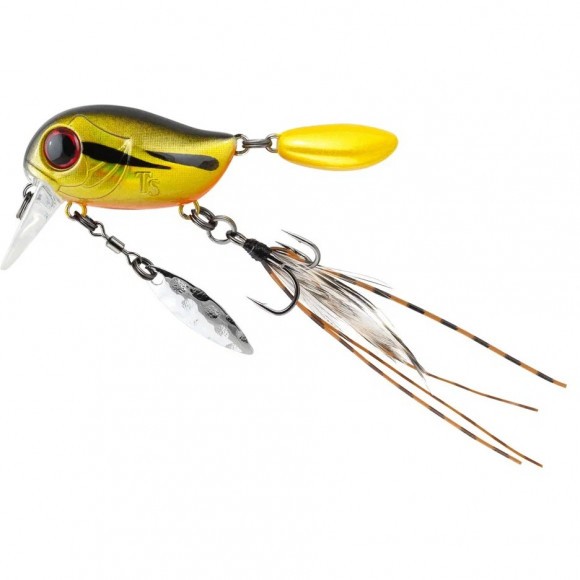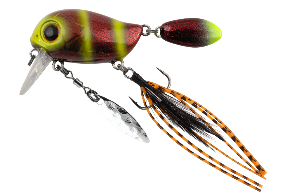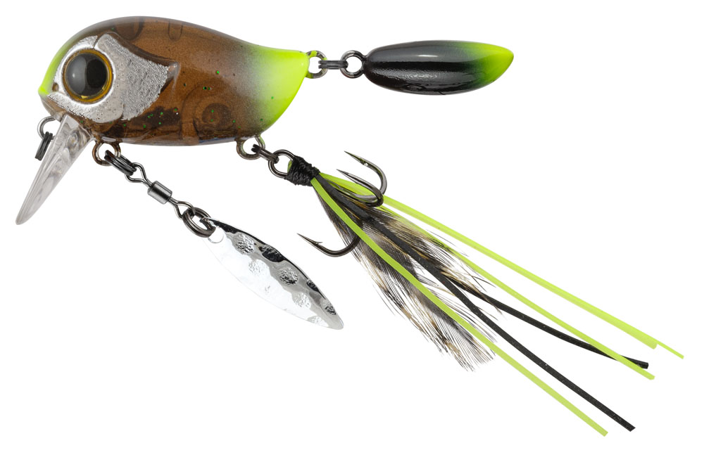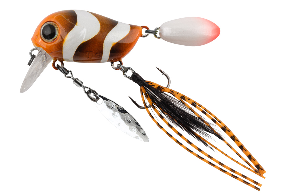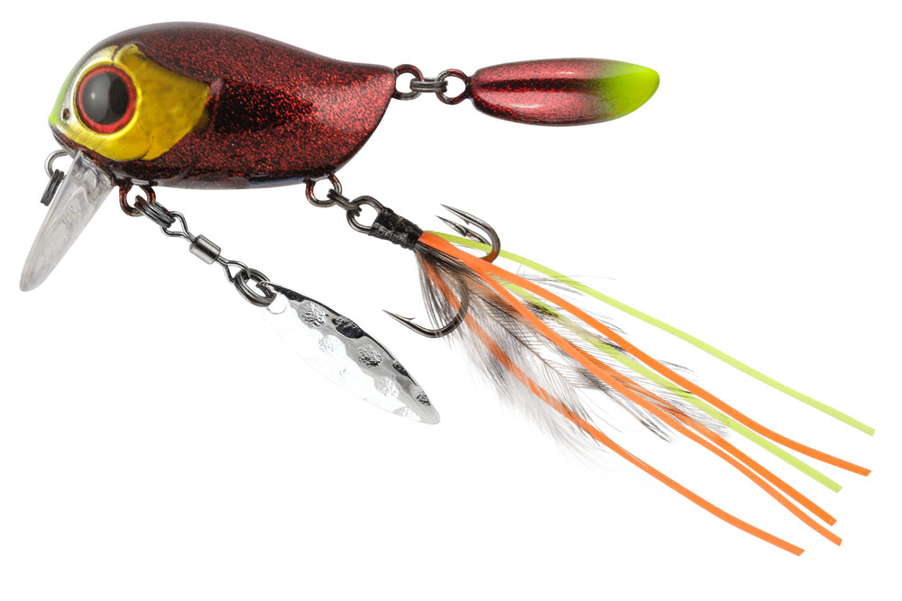Особенности дизайна: KIKI 54F не похож на остальные воблеры-кренки, поскольку имеет в своей конструкции ряд оригинальных дополнительных элементов, призванных привлечь внимание хищной рыбы. Под брюшком у приманки находится подвижный металлический лепесток, который вращается при проводке, в задней части – жесткий пластиковый хвостик, который при движении в воде колеблется из стороны в сторону, а единственный тройник воблера оснащён мушкой из перьев и довольно длинных силиконовых нитей. Головная часть KIKI 54F рельефно имитирует жаберные крышки, а вклеенные объемные 3D глаза завершают реалистичный дизайн приманки.