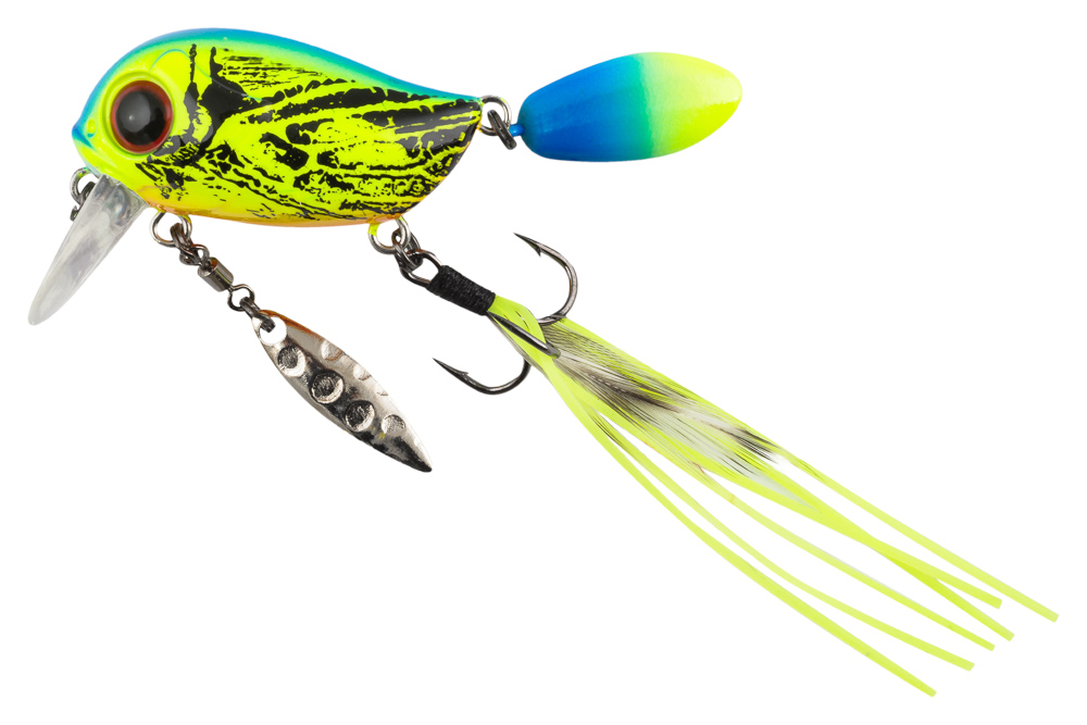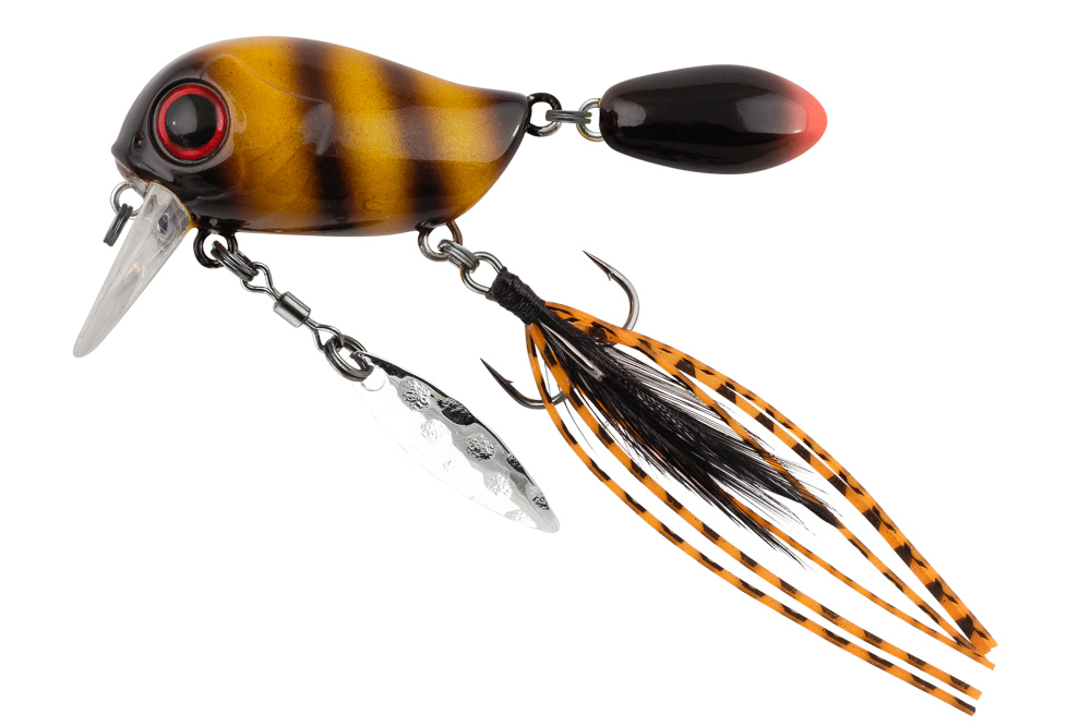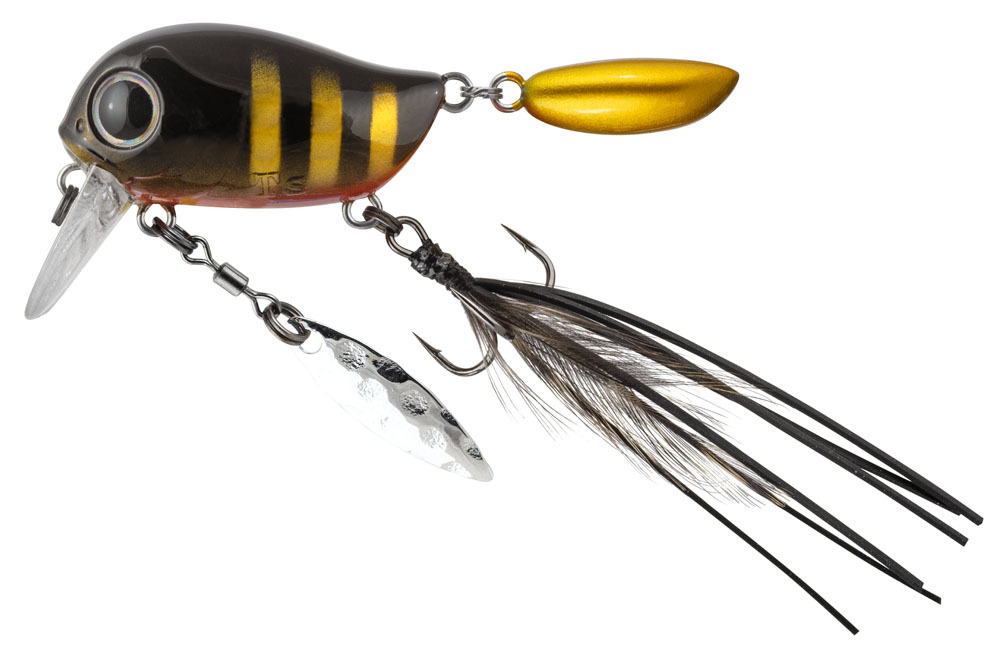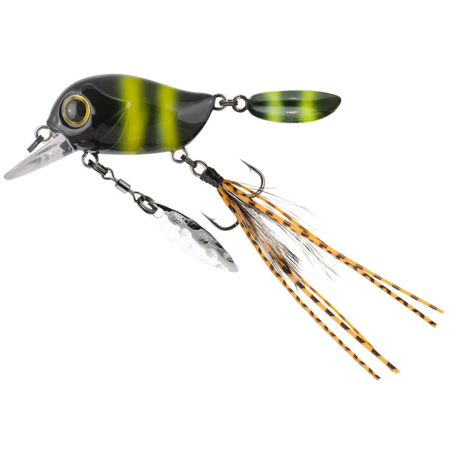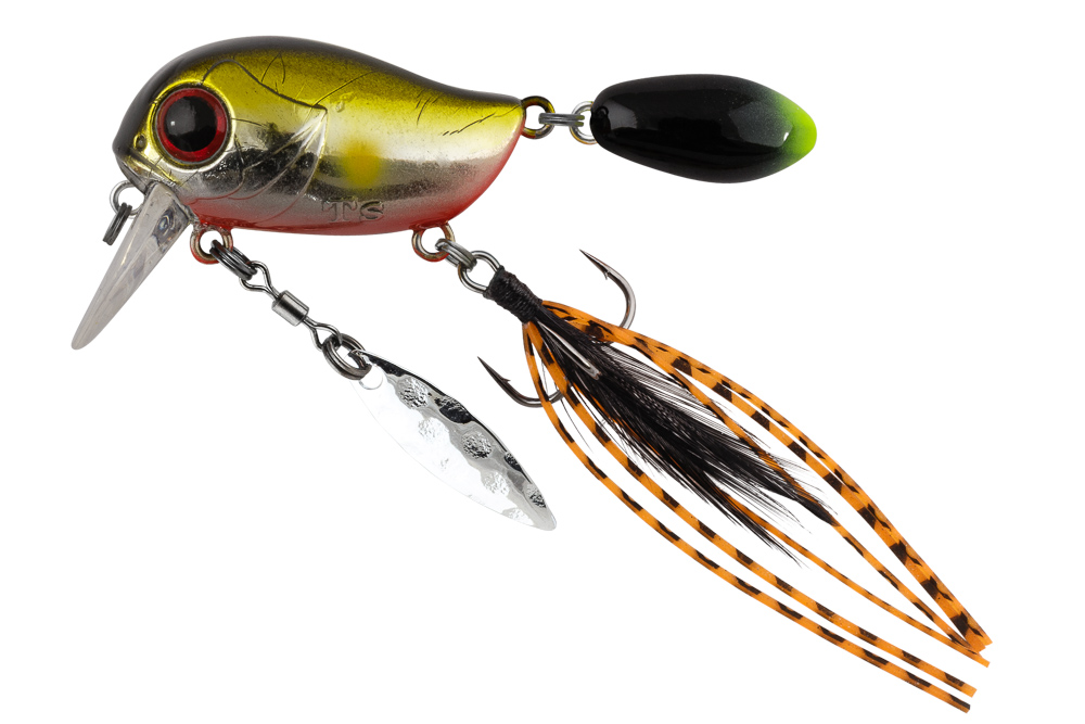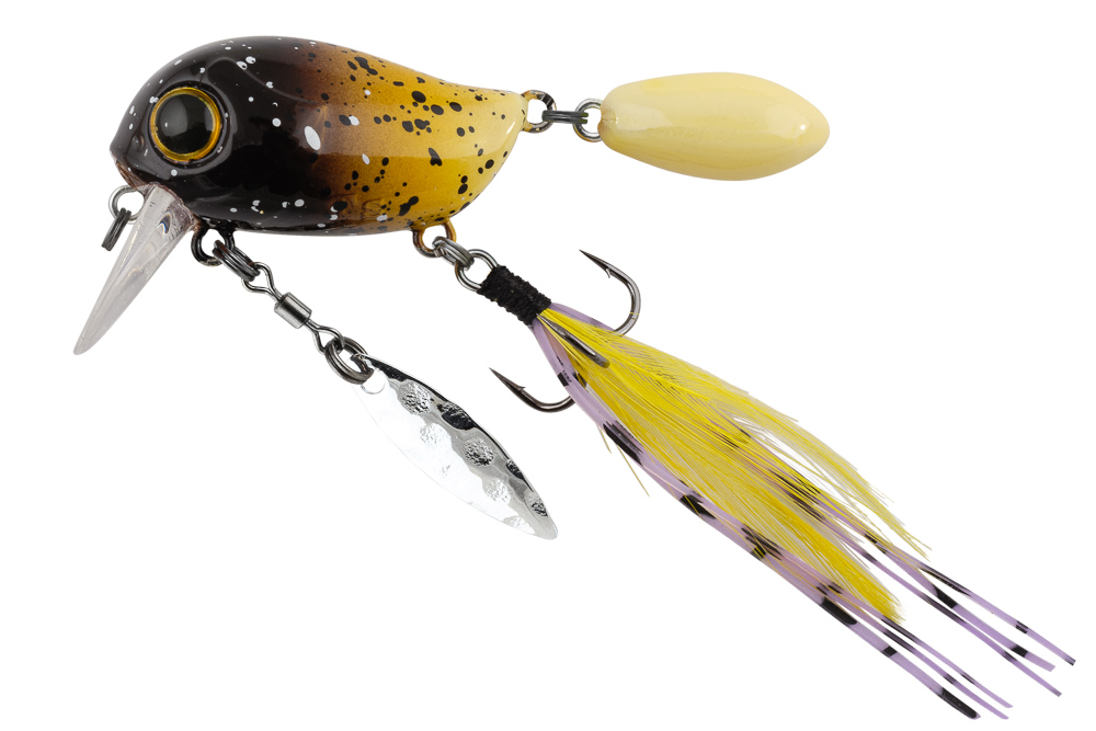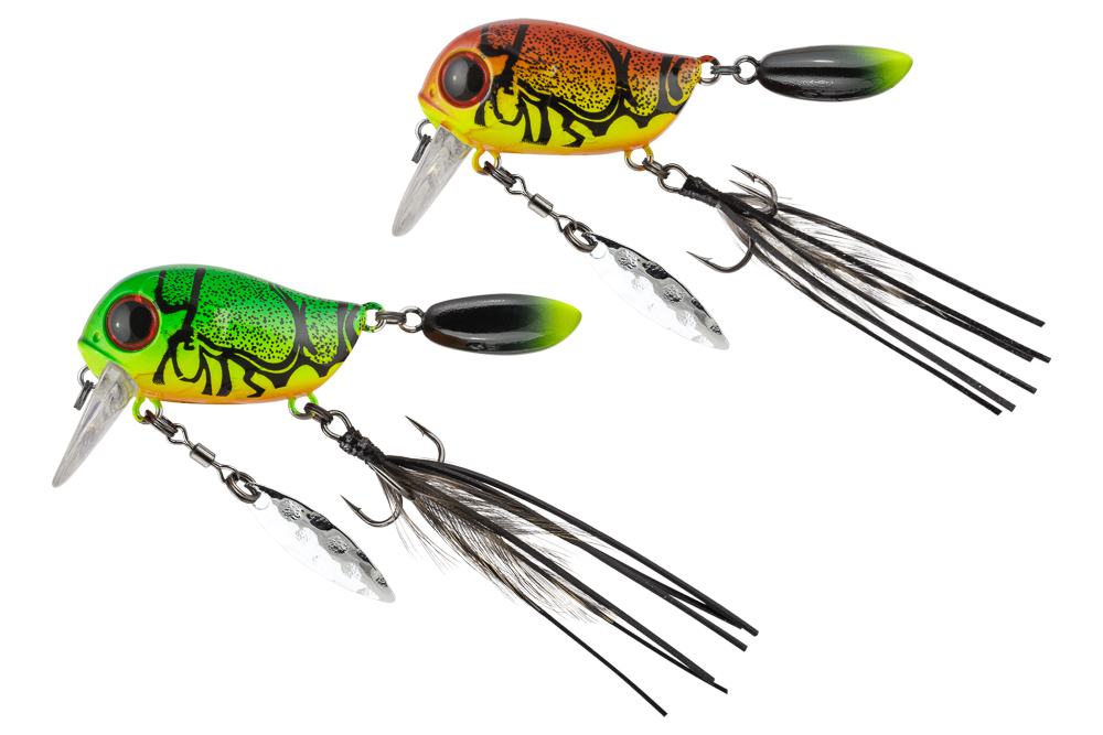 Особенности дизайна: KIKI 54F не похож на остальные воблеры-кренки, поскольку имеет в своей конструкции ряд оригинальных дополнительных элементов, призванных привлечь внимание хищной рыбы. Под брюшком у приманки находится подвижный металлический лепесток, который вращается при проводке, в задней части – жесткий пластиковый хвостик, который при движении в воде колеблется из стороны в сторону, а единственный тройник воблера оснащён мушкой из перьев и довольно длинных силиконовых нитей. Головная часть KIKI 54F рельефно имитирует жаберные крышки, а вклеенные объемные 3D глаза завершают реалистичный дизайн приманки.