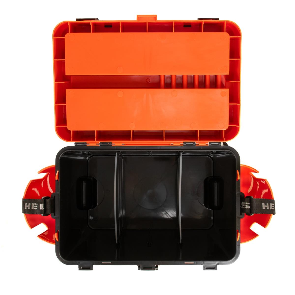 Пластик не подвержен деформациям и прекрасно удерживает первоначальную форму ящика даже при значительном весе рыбака. Ящик из такого пластика не впитывает запахи и легко отмоется от рыбной слизи, глины и других загрязнений. Функциональное основное отделение служит своеобразным каркасом, предотвращающим прогибы ящика и надежно удерживающим вес рыбака. Съемные перегородки предназначены для более удобного хранения принадлежностей.