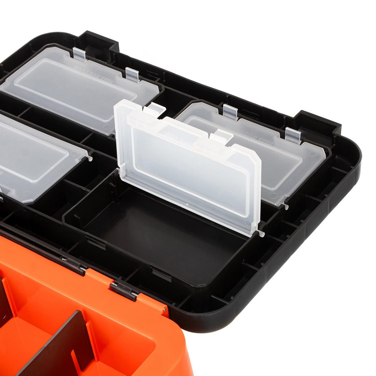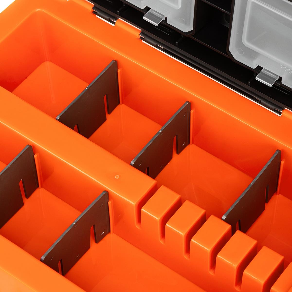 На внутренней стороне откидной крышки размещены 4 прозрачных закрывающихся бокса, в которых достаточно места для блесен, балансиров, рыболовных крючков, мормышек и прочих мелких снастей. Вставка-органайзер имеет две секции, где можно удобно разместить удильники, а при необходимости эти секции можно разделить на более мелкие отделы с помощью съемных перегородок, входящих в комплект. Также имеются 6 прорезей для фиксации коротких удочек.