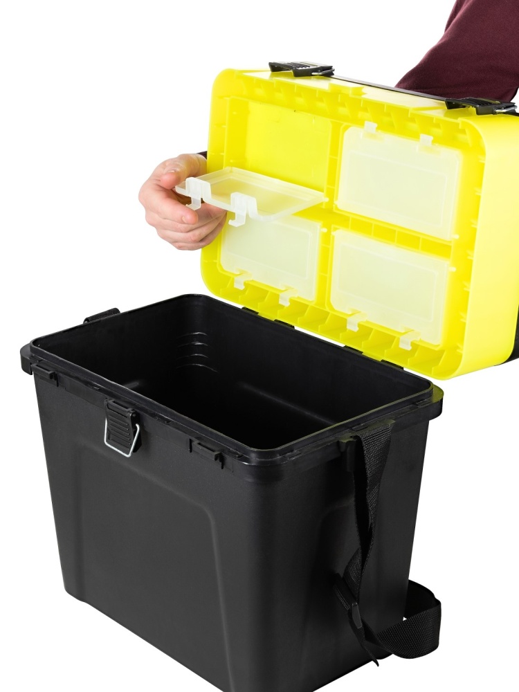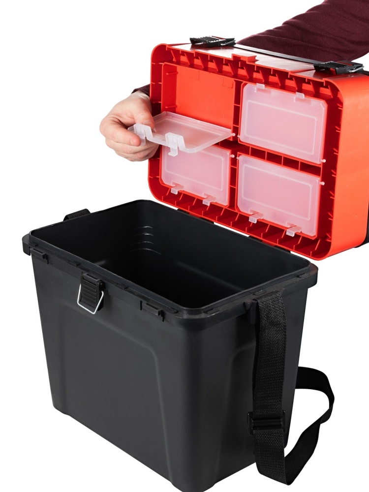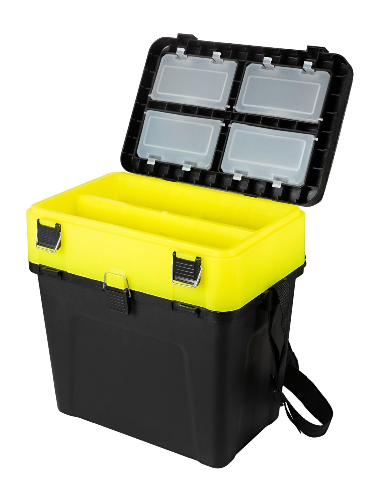 Ящик рыболовный обладает хорошо продуманным и организованным внутренним пространством. Основной объем ящика (габариты 33.5 х 21 х 27 см) предназначен для хранения и транспортировки выловленных хвостов. Крышка с двумя ярусами позволяет хранить приманки и различные рыболовные аксессуары. Для удобства переноски имеется съемный плечевой ремень. Накладка на крышку из пенки.